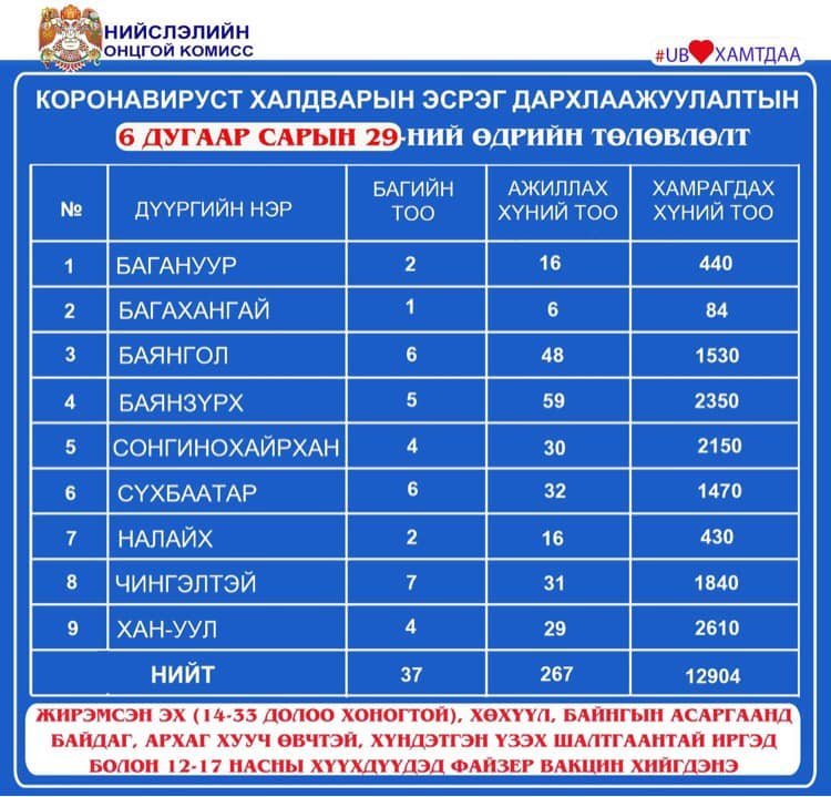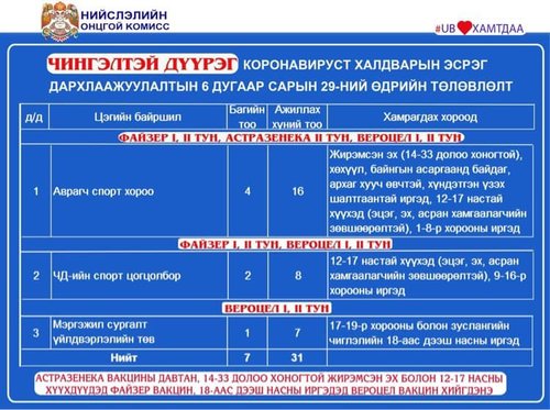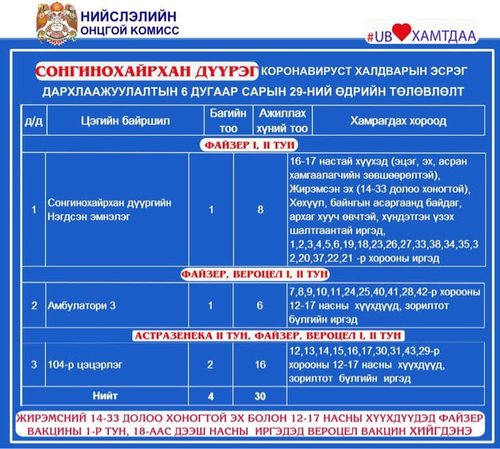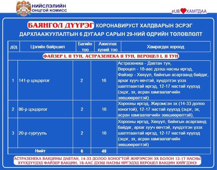 Өнөөдөр Улаанбаатар хотод суурин 23 цэгт 37 багийн 267 эмч, ажилтан ажиллаж, 12904 иргэнийг дархлаажуулахаар төлөвлөөд байна. Дархлаажуулалтын цэгүүдийг дүүрэг тус бүрээр танилцуулъя.