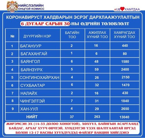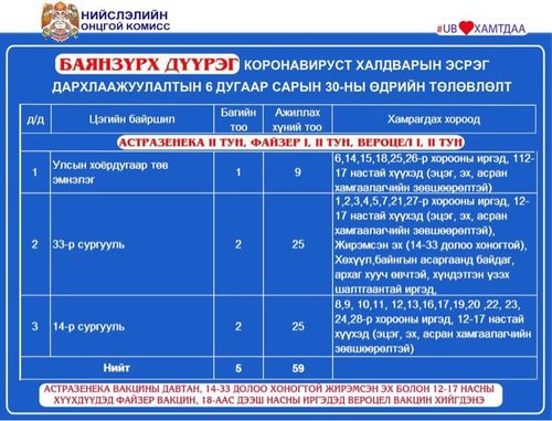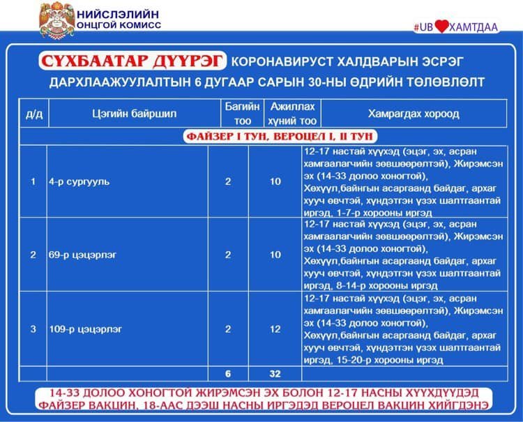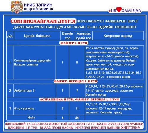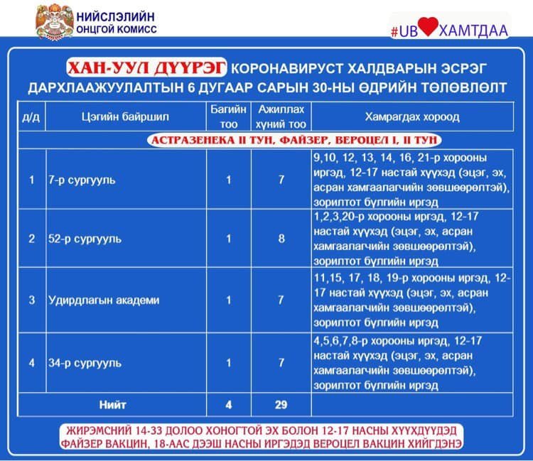 Өнөөдөр Улаанбаатар хотод 23 суурин цэгт 37 багийн 263 эмч, ажилтан ажиллаж, 13040 иргэнийг дархлаажуулахаар төлөвлөлөө. дархлаажуулалтын цэгүүдийг дүүрэг тус бүрээр танилцуулж байна.