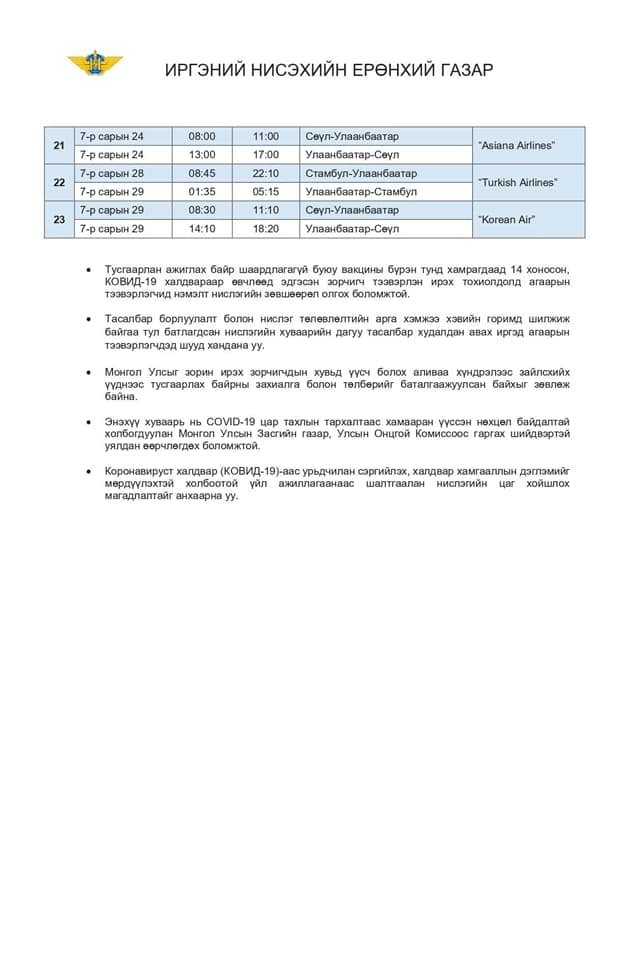 Ингэхдээ тасалбар борлуулалт болон нислэг төлөвлөлтийн арга хэмжээ хэвийн горимд шилжсэн учраас батлагдсан нислэгийн хуваарийн дагуу тасалбар худалдан авах иргэд агаарийн тээвэрлэгчдэд шууд хандах юм гэж УОК-ын Шуурхай штабаас мэдээллээ.