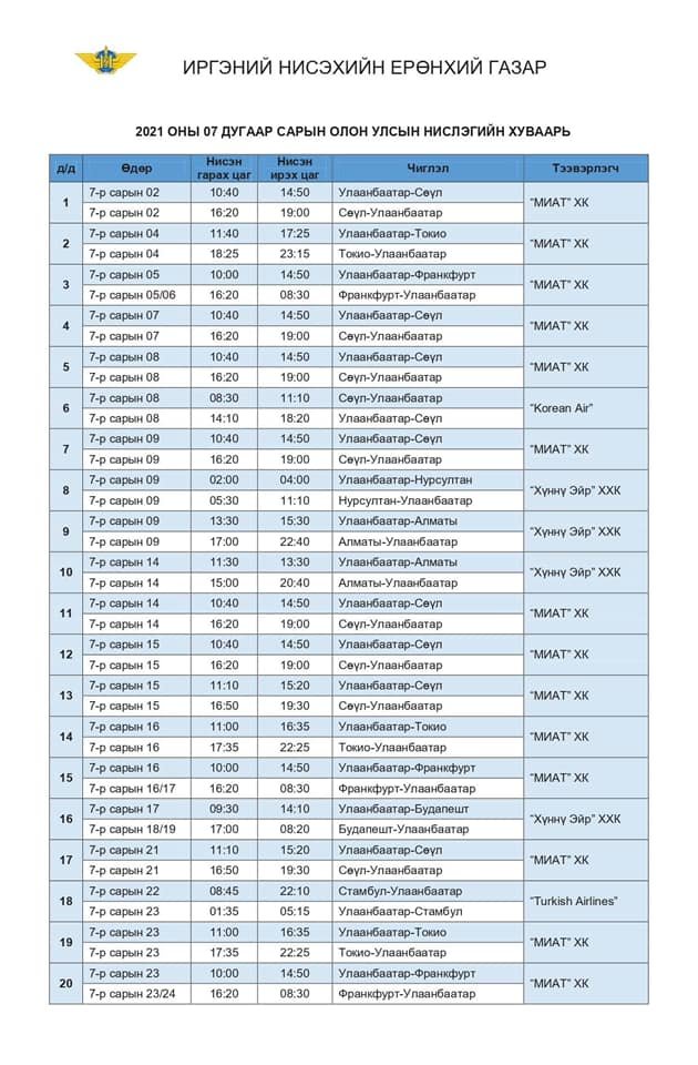 Иргэний нисэхийн Ерөнхий газраас /ИНЕГ/ долдугаар сарын нислэгийн хуваарийг танилцууллаа. Энэ сард нийт 23 удаагийн нислэгийг Өмнөд Солонгос, Япон, Унгар, Турк, Герман, Казахстан улс руу хийхээр төлөвлөөд байна.