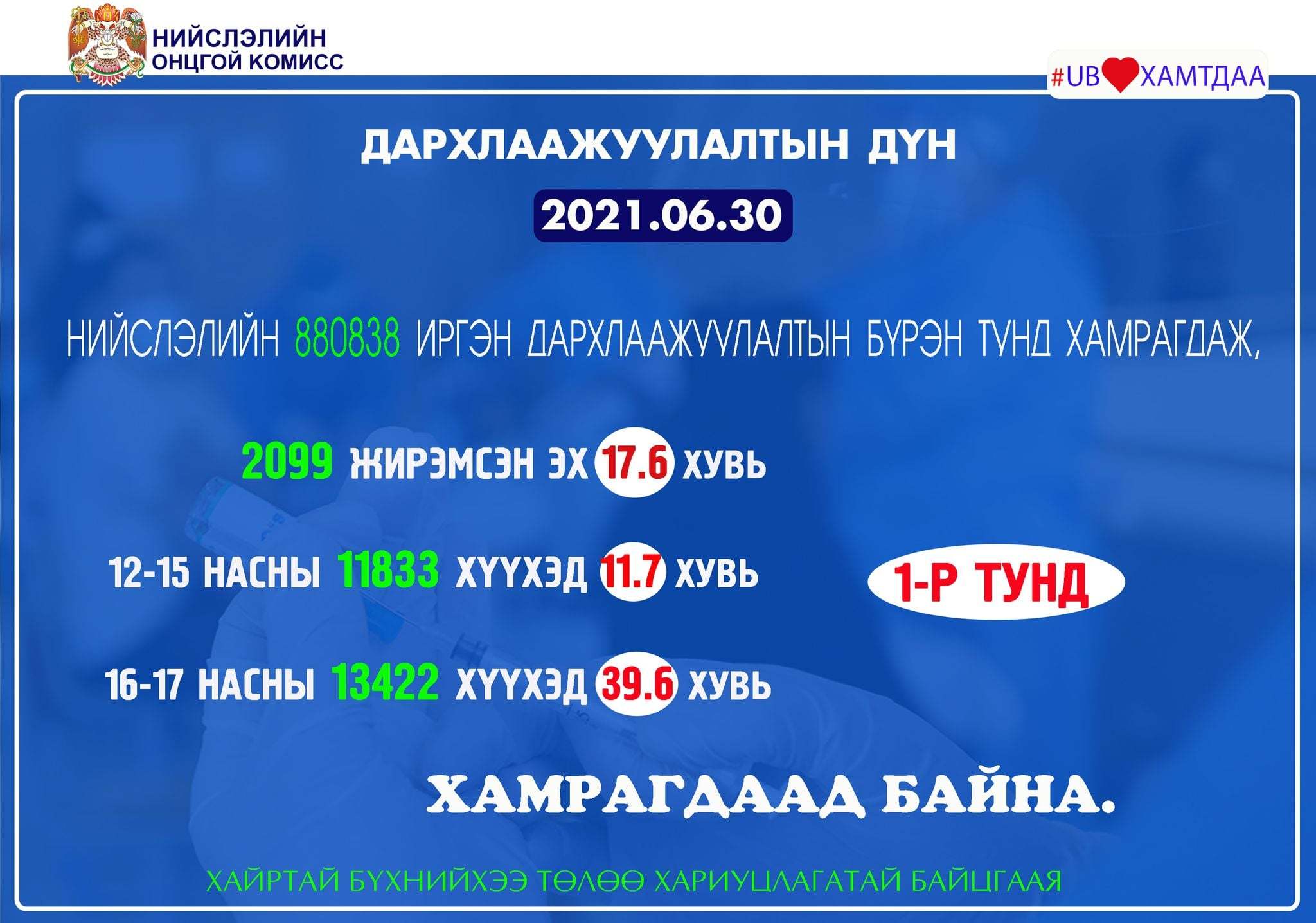 Вакцинжуулалт эхэлснээс хойш нийслэлийн 18-аас дээш насны 1.008.666 иргэн I тунд, 880.838 иргэн II тунд хамрагдаад байна. Мөн нийт 2099 (17.6 хувь) жирэмсэн эх, 12-15 насны 11833 (11.7 хувь), 16-17 насны 13422 (39.6 хувь) хүүхэд дархлаажуулалтад хамрагдаж, вакцины I тун хийлгээд байна.
