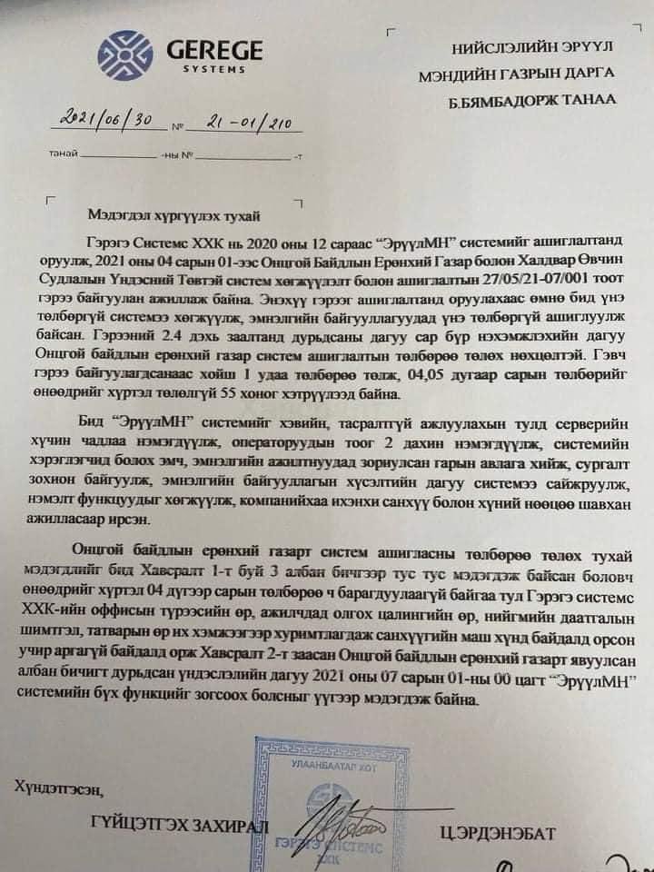 Коронавирусийн халдварын батлагдсан тохиолдлын ойрын хавьтлуудаас ПСР шинжилгээ авахгүй байгааг бид мэдээлсэн. Мөн өмнө нь ПСР шинжилгээ өгсөн иргэд хариугаа авч чадахгүй, халдвар авсан эсэхээ баталгаажуулж чадахгүй байна. Тэгвэл энэ асуудлын шалтгаан тодорхой болжээ. Гэрэгэ Системс ХХК төлбөрийн асуудлаас үүдэн ЭРҮҮЛМН системийг хааснаа нийслэлийн Эрүүл мэндийн газрын дарга Б.Бямбадоржид мэдэгджээ. Тус компаниас ОБЕГ-т төлбөрийн талаар удаа дараа сануулж, мэдэгдсэн ч 04, 05 дугаар сарын төлбөрийг өнөөг хүртэл төлөөгүй байгаа аж. Тиймээс тус компанийн системийг хаах хүртэл арга хэмжээ авчээ.