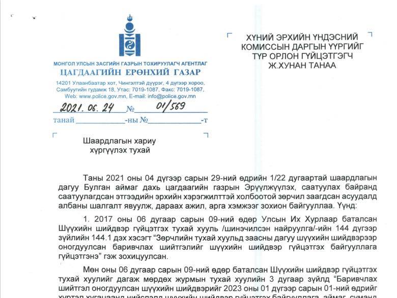 Комиссын гишүүний шаардлагын дагуу “Баривчлах байрны дотоод журам” зөрчсөн алба хаагчдад сахилгын шийтгэл ноогдуулж, бусад зөрчлийг арилгуулах чиглэл өгч, арга хэмжээ авч ажилласан тухай ЦЕГ-аас ирүүлсэн хариу албан бичигт дурджээ. Мөн баривчлах, саатуулах байрны орчин нөхцөлийг сайжруулах зорилгоор шинээр барилга барих зураг төсөл боловсруулж, холбогдох байгууллагуудад хүргүүлсэн боловч өнөөдрийг хүртэл шийдэгдээгүй байна.