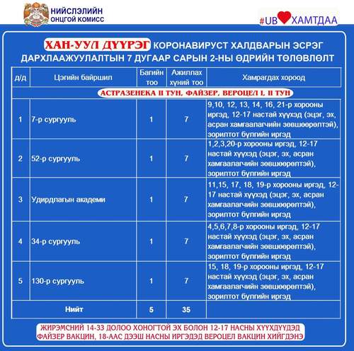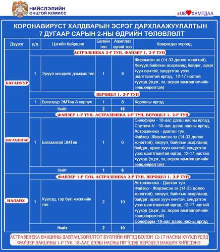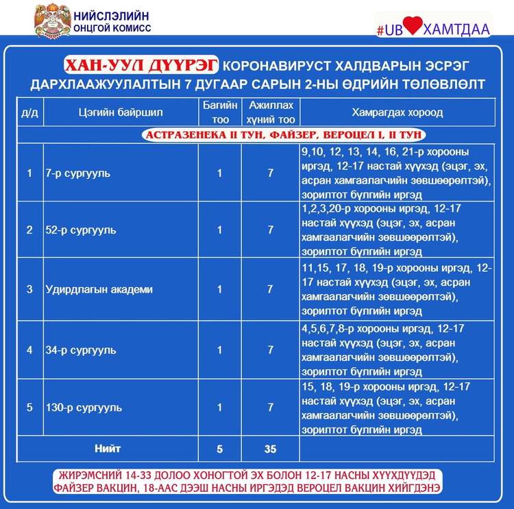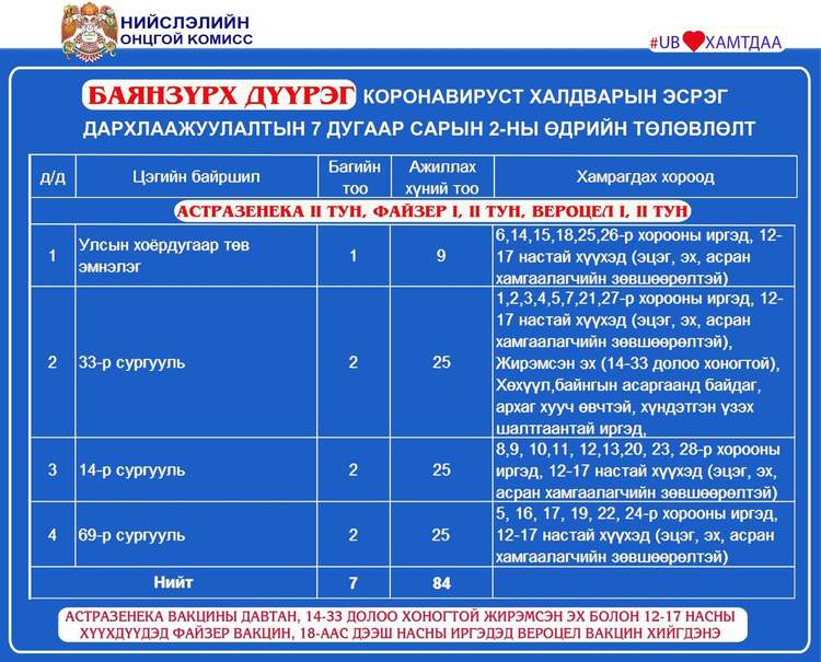 Өнөөдөр Улаанбаатар хотод 25 суурин цэгт 40 багийн 288 эмч, ажилтан ажиллаж, 13815 иргэнийг дархлаажуулна. Дархлаажуулалтын цэгүүдийг дүүрэг тус бүрээр танилцуулж байна.
