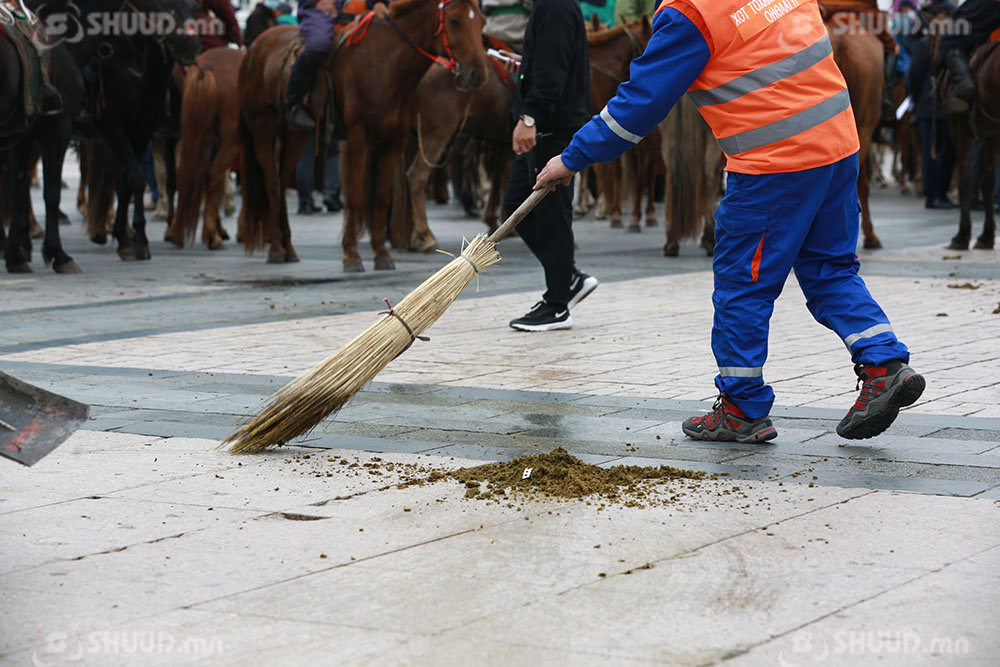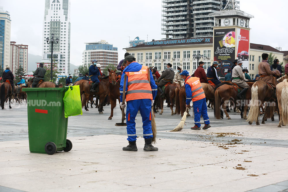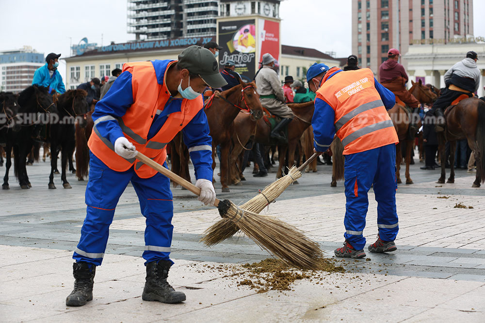 Үндэсний баяр наадмыг хойшуулах санал гаргасан УОК-ын шийдвэрийг эсэргүүцсэн уяачид яг одоо Сүхбаатарын талбайд цуглаан хийж байна. Тэдний эсэргүүцлийн цуглаан ТҮК-ийн цэвэрлэгчдийн ажил дээр ажил нэмлээ. Тэд өглөөнөөс үдэш хүртэл хотын гудамж талбайг цэвэрлэдэг. Харин энэ удаа уяачдын морины морины хомоол, шээсийг цэвэрлэх ажилтай боллоо.