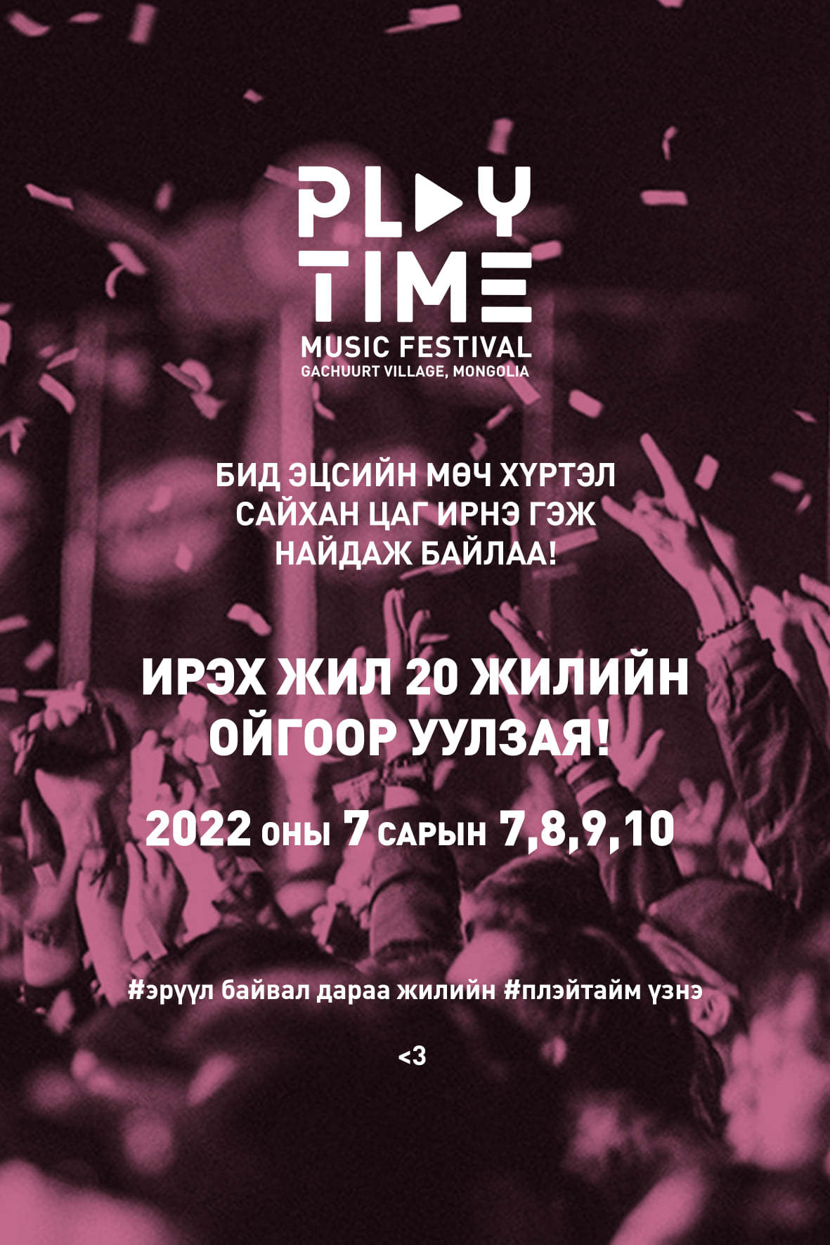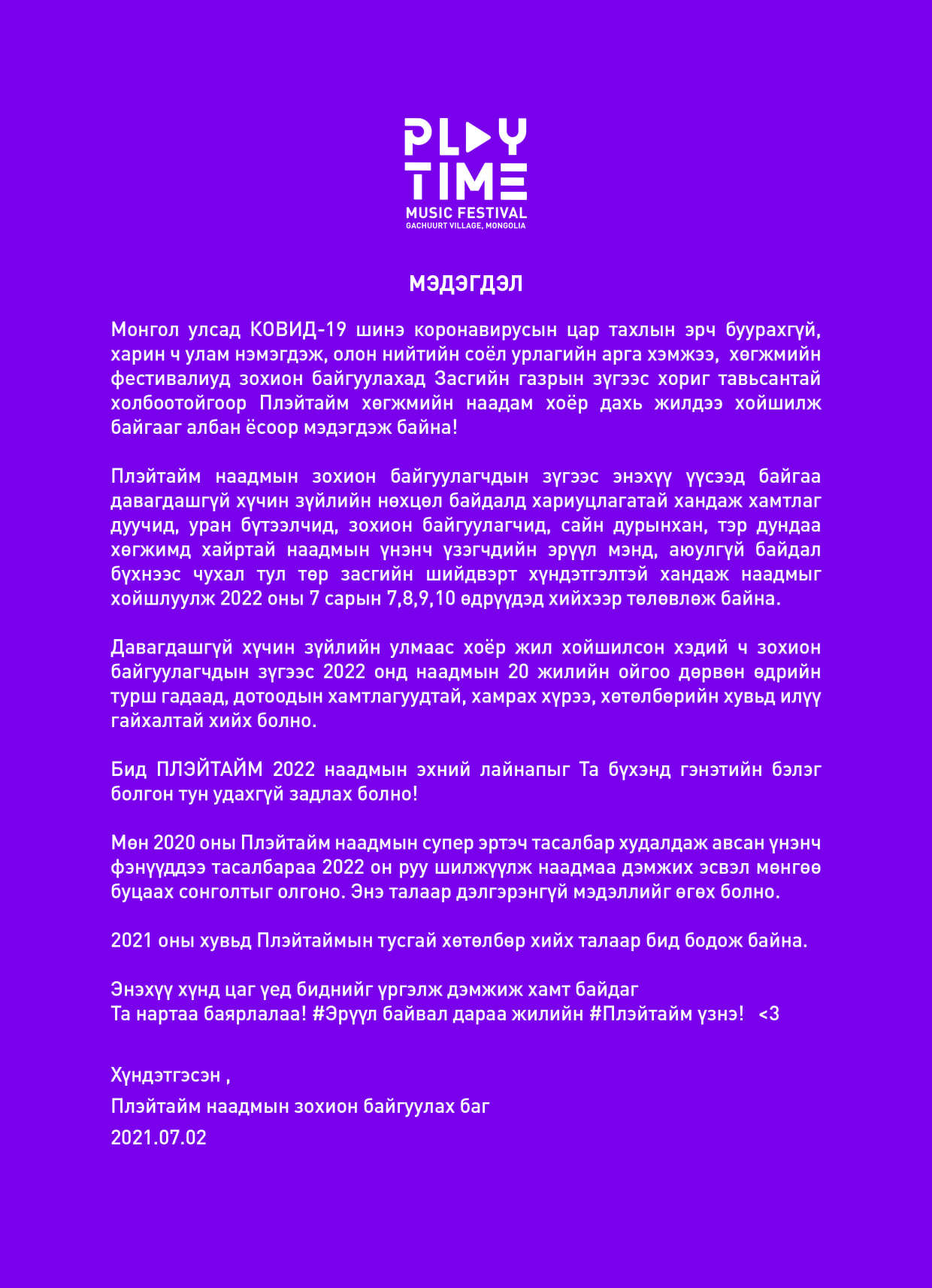 Плэйтайм олон улсын хөгжмийн хөгжмийн наадам хоёр дахь жилдээ хойшилжээ. Тодруулбал, халдварын эрч буурахгүй, нэмэгдэж, олон нийтийн соёл урлагийн арга хэмжээ, хөгжмийн фестивалиуд зохион байгуулахад Засгийн газрын зүгээс хориг тавьсантай холбоотойгоор Плэйтайм хөгжмийн наадам хоёр дахь жилдээ хойшлуулжээ. Тиймээс энэ жилийн наадмын тасалбар худалдаж авсан үзэгчид мөнгөө буцааж авах эсвэл дараа жилийн дараа жилийн наадам руу шилжүүлэх боломжтой аж.