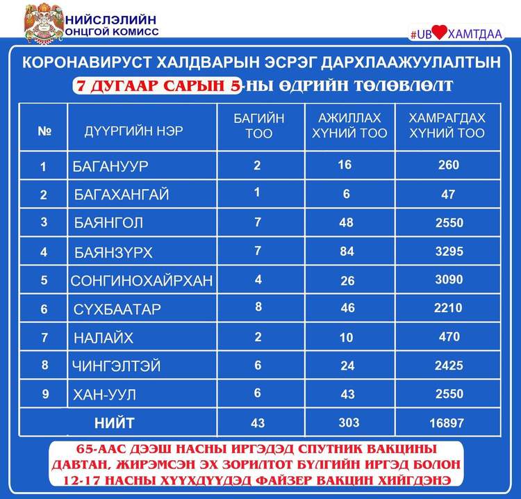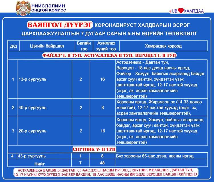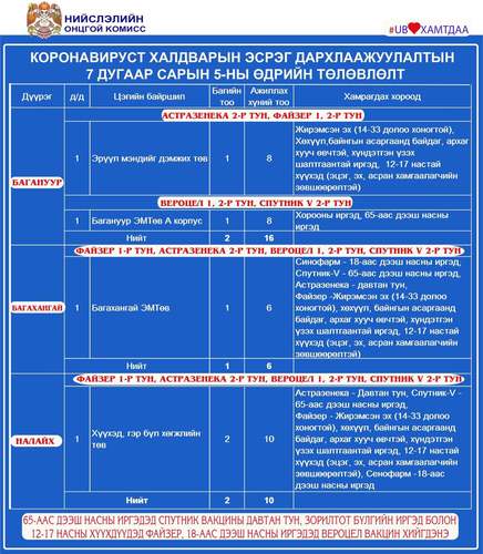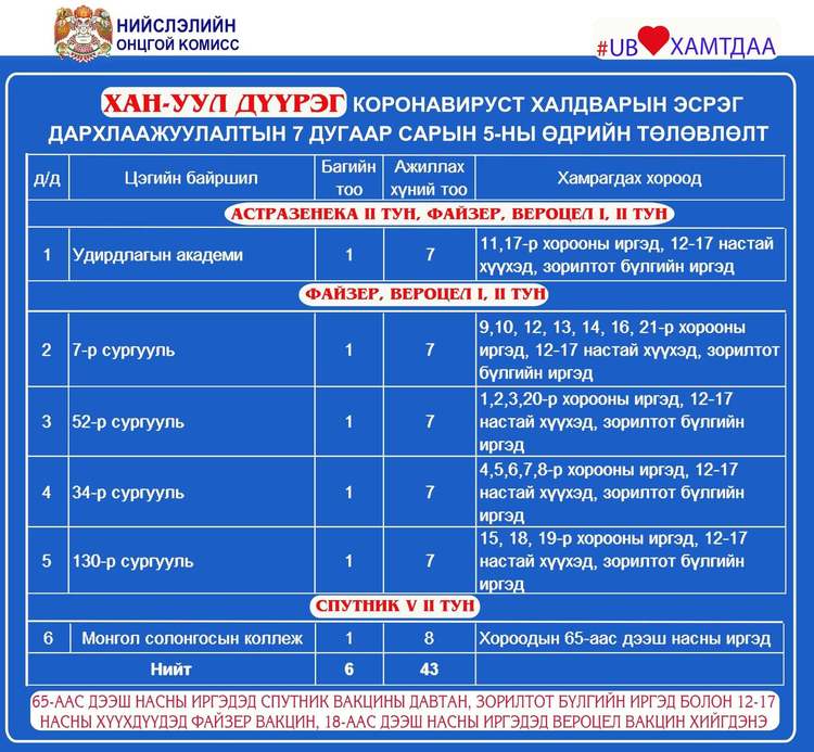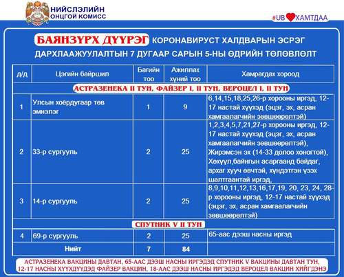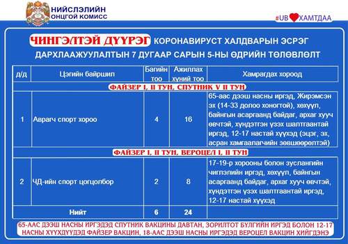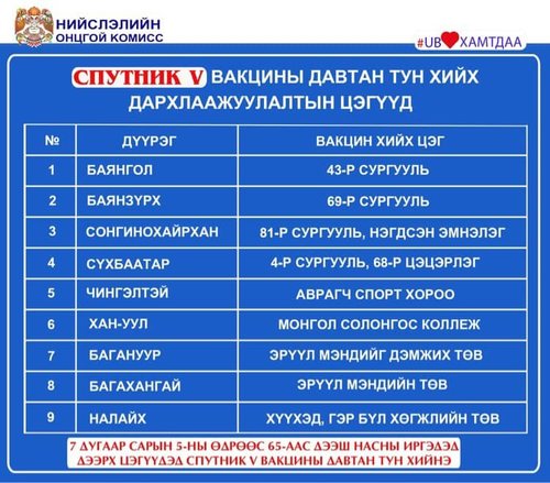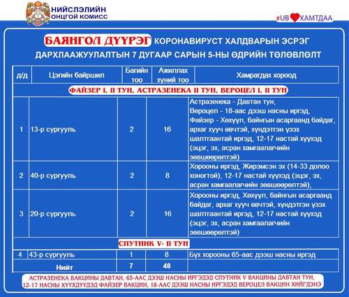 Өнөөдөр 65-аас дээш насны иргэдэд Спутник V вакцины давтан тун хийж эхэлнэ. Мөн энэ өдөр Улаанбаатар хотод суурин 27 цэгт 43 багийн 303 эмч, ажилтан ажиллаж, 16.897 иргэнийг дархлаажуулахаар төлөвлөжээ.