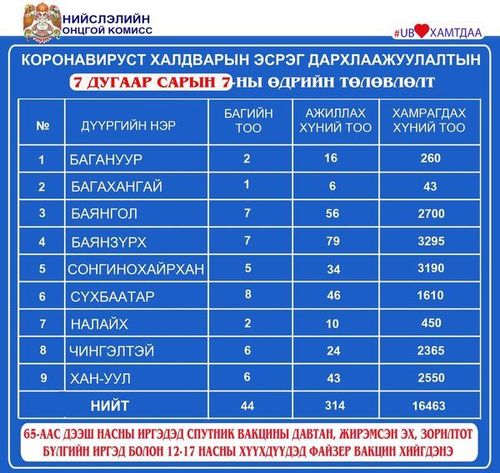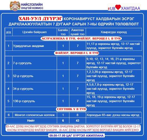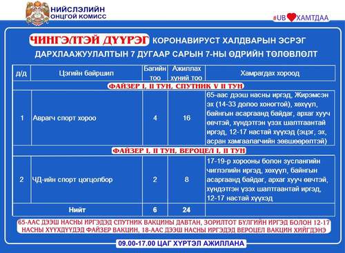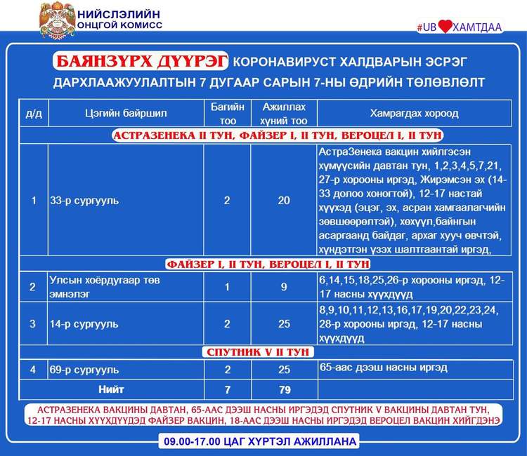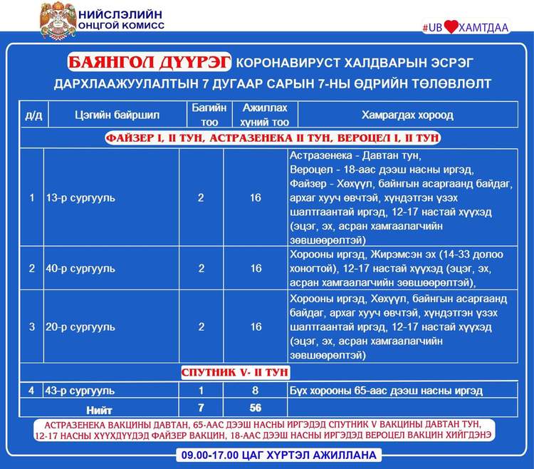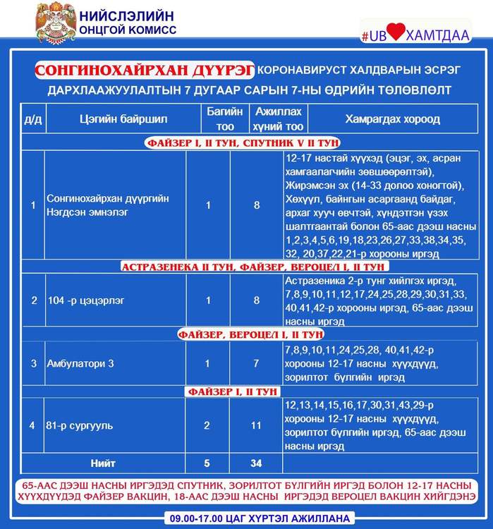 Өнөөдөр Улаанбаатар хотод суурин 28 цэгт 44 багийн 314 эмч, ажилтан ажиллаж, 16463 иргэнийг дархлаажуулахаар төлөвлөлөө. Дархлаажуулалтын цэгүүдийг дүүрэг тус бүрээр танилцуулж байна.