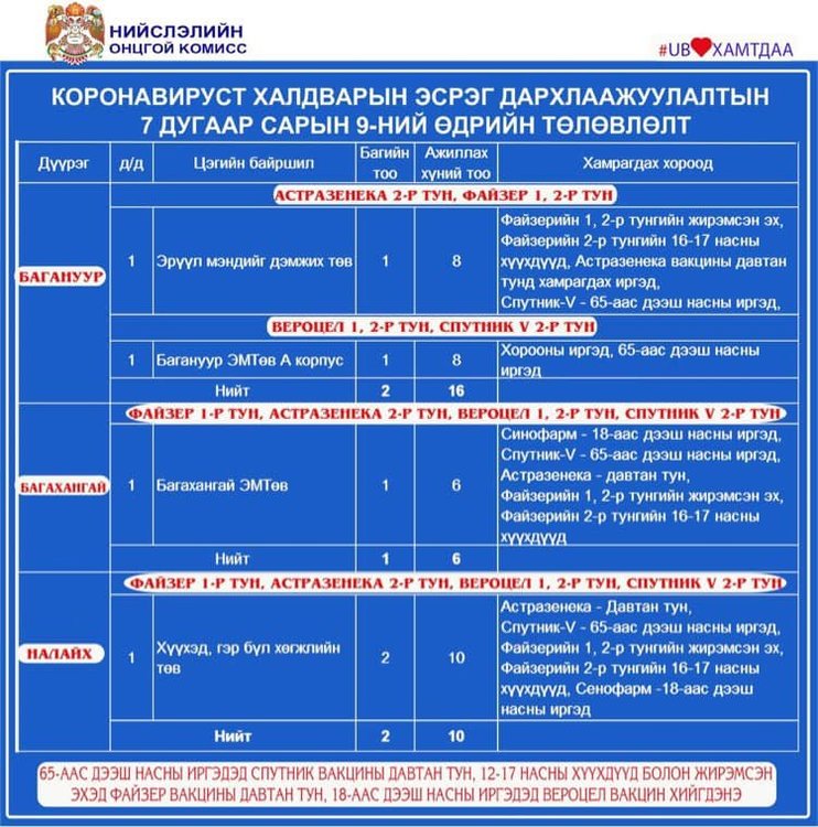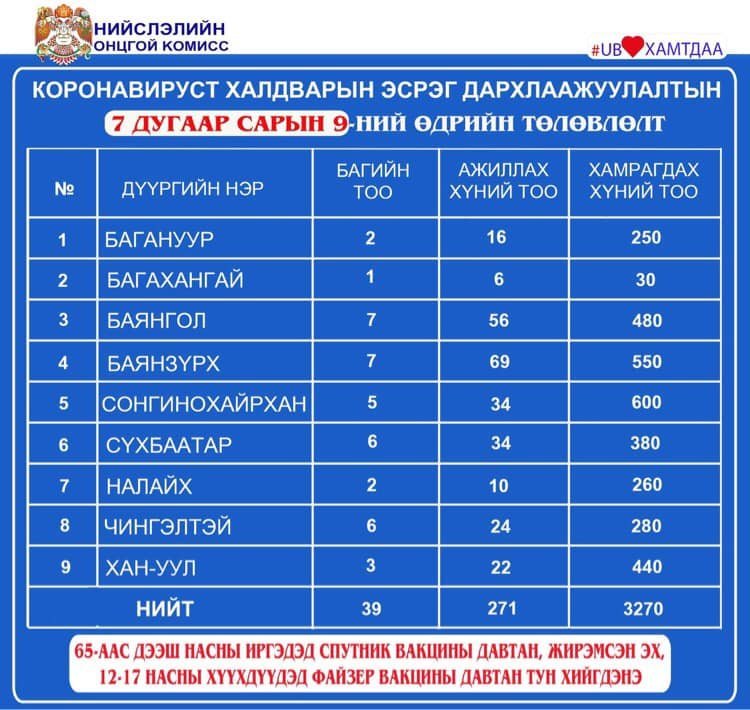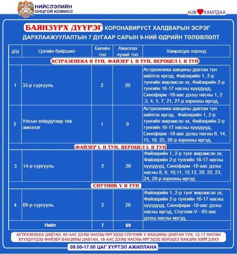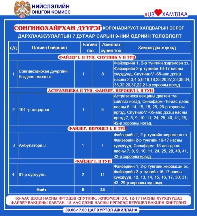 Өнөөдөр Улаанбаатар хотод суурин 24 цэгт 39 багийн 271 эмч, ажилтан ажиллаж, 3270 иргэнийг дархлаажуулахаар төлөвлөлөө. Дархлаажуулалтын цэгүүдийг дүүрэг тус бүрээр танилцуулж байна.