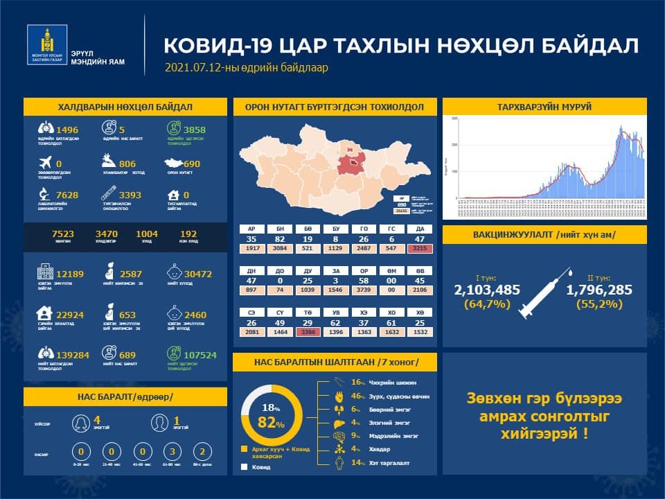 Эрүүл мэндийн яамнаас 07 дугаар сарын 12-ны өдрийн коронавирусийн нөхцөл байдлыг мэдээллийг гаргажээ. Энэ өдөр шинээр 1 496 тохиолдол бүртгэгдэж, 3 858 иргэн эдгэрсэн байна. Мөн хугацаанд коронавирусийн халдвараар таван хүн нас баржээ.