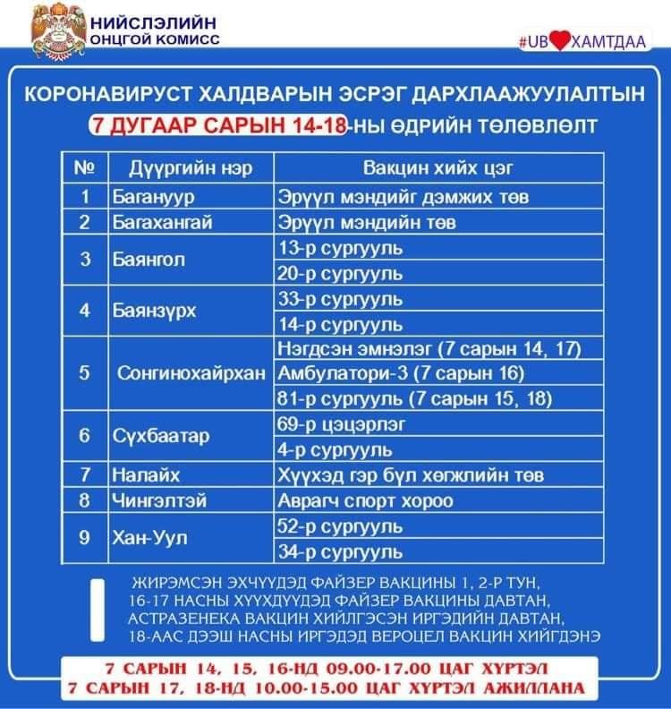 Дархлаажуулалтын цэгүүд өнөөдрөөс хэвийн ажиллаж эхэллээ. Өнөөдөр Улаанбаатар хотод 14 суурин цэгт, 20 багийн 141 эмч, ажилчид 3159 иргэнийг дархлаажуулна.