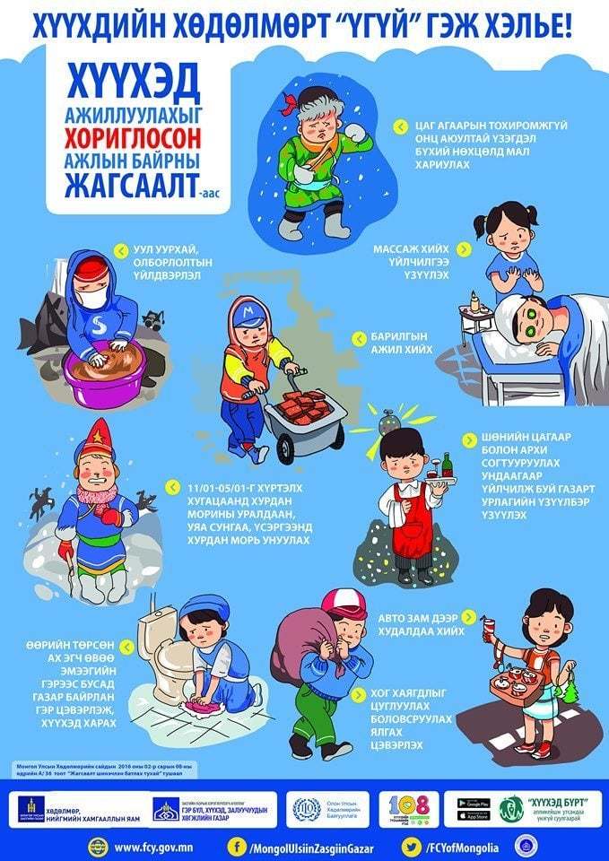 Монгол Улсын Хөдөлмөрийн сайдын тушаалаар Хүүхэд ажиллуулахыг хориглосон ажлын байрны жагсаалтыг гаргасан байдаг. Тус жагсаалтад