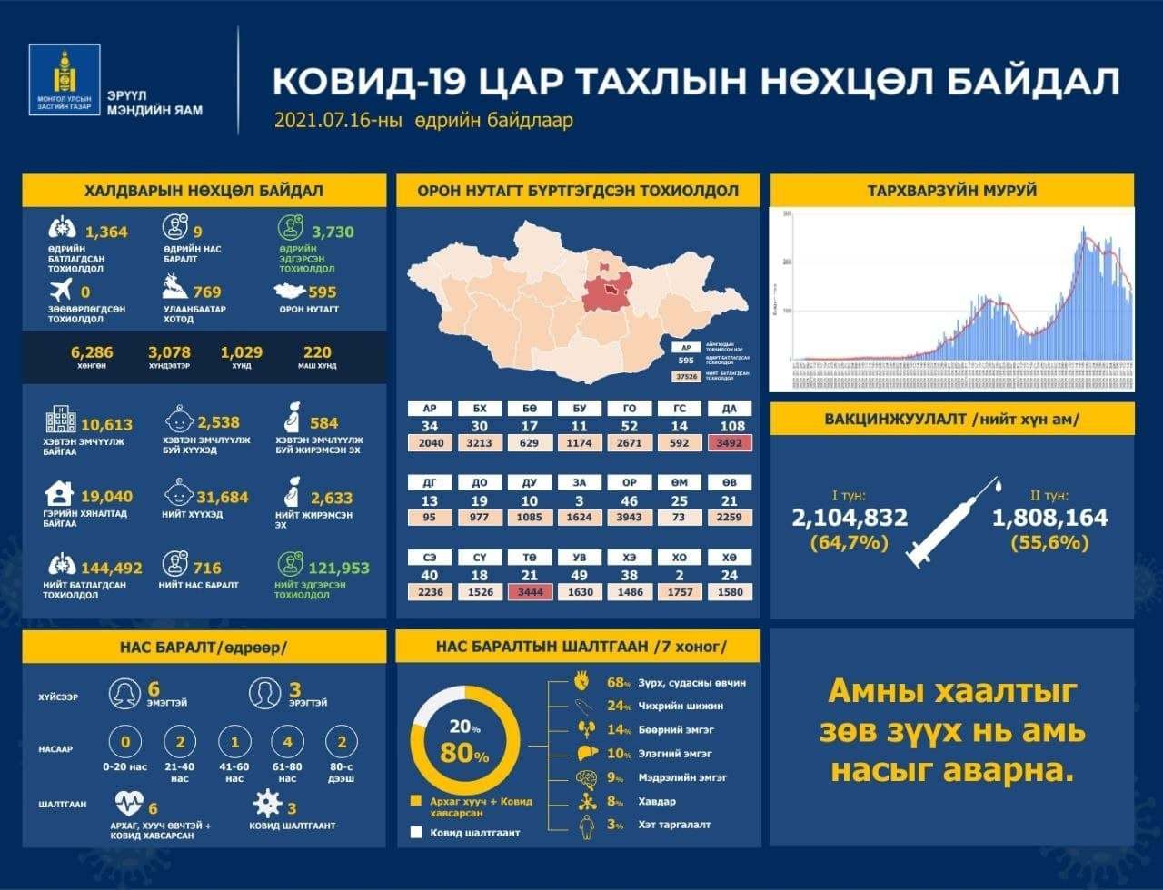 Эрүүл мэндийн яам коронавирусийн халдварын 07 дугаар сарын 16-ны өдрийн мэдээллийг танилцуулж байна. Энэ өдөр шинээр шинээр 1 364 тохиолдол бүртгэгдэж, 9 хүн нас барсан байна.