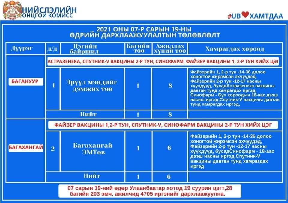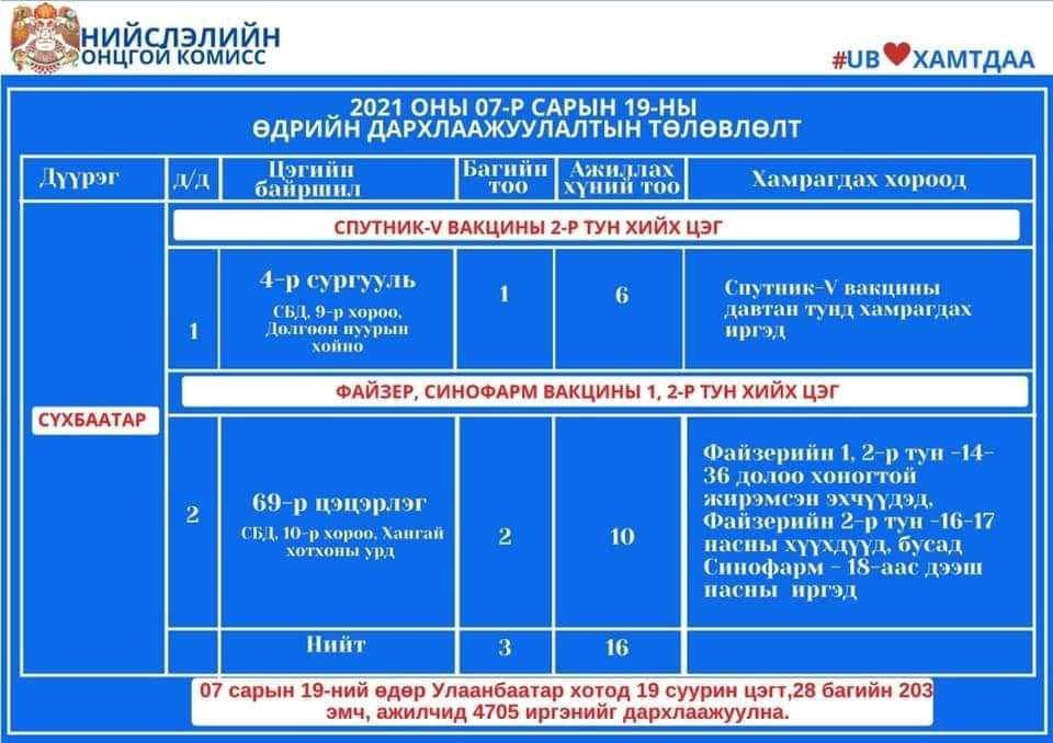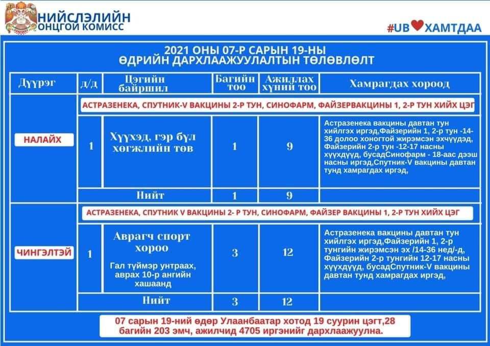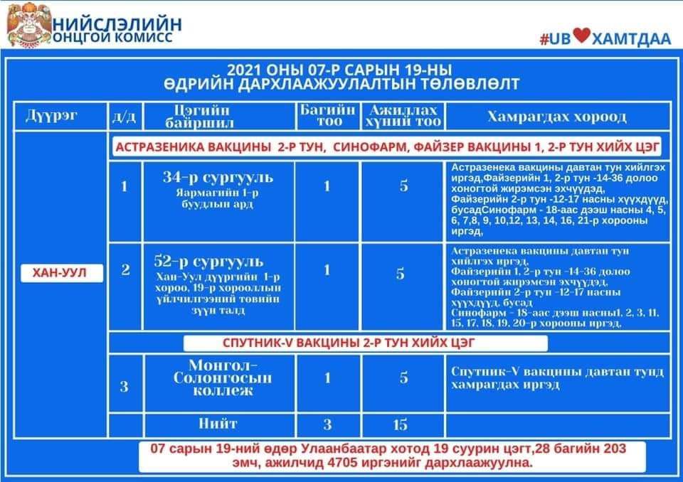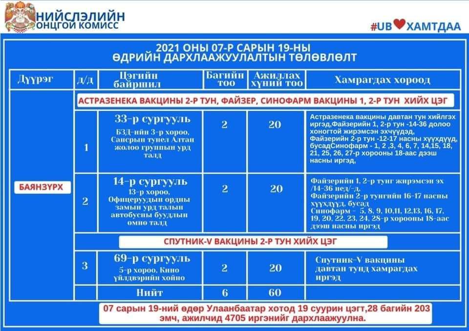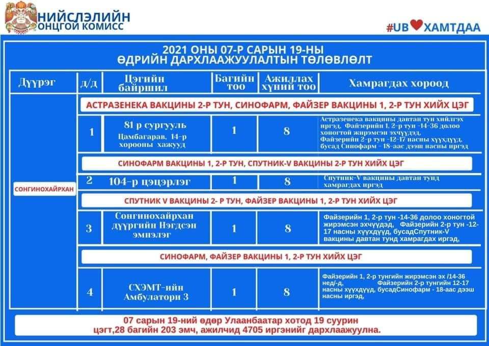 Улаанбаатар хотод өнөөдөр суурин 19 цэгт 28 багийн 203 эмч, ажилтан ажиллаж, 4705 иргэнийг дархлаажуулахаар төлөвлөлөө. Дархлаажуулалтын цэгүүдийг дүүрэг тус бүрээр танилцуулж байна.
