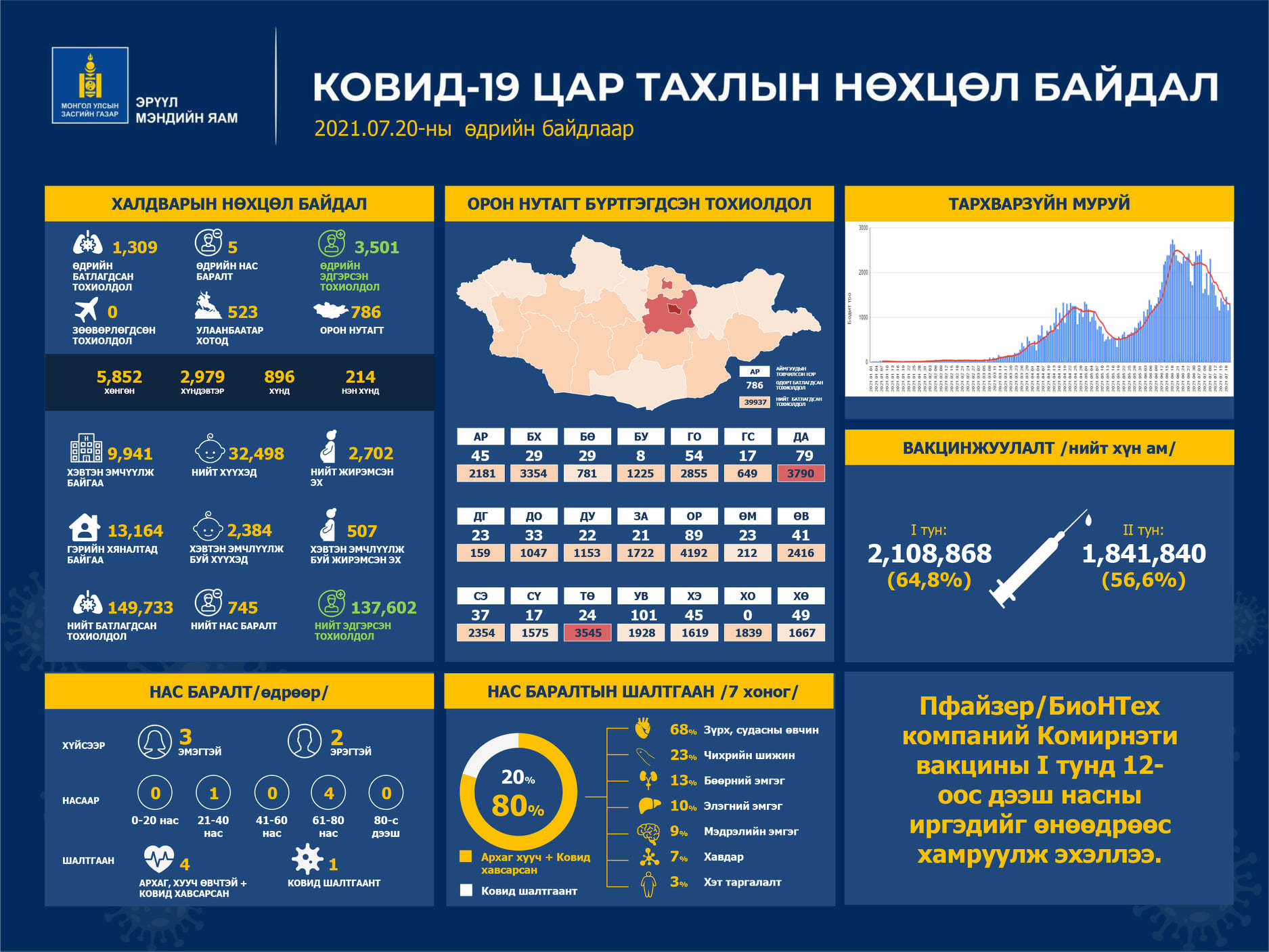 Эрүүл мэндийн яамнаас коронавирусийн халдварын 2021 оны 07 дугаар сарын 20-ны өдрийн нөхцөл байдлын мэдээллийг гаргажээ. Энэ өдөр шинээр 1309 тохиолдол бүртгэгджээ. Шинээр батлагдсан тохиолдлын 523 нь Улаанбаатар хотод, 786 нь орон нутагт, байна. Мөн хугацаанд халдварын улмаас 5 хүн нас баржээ. Түүнчлэн сүүлийн 24 цагийн хугацаанд 3501 хүн эдгэрлээ.