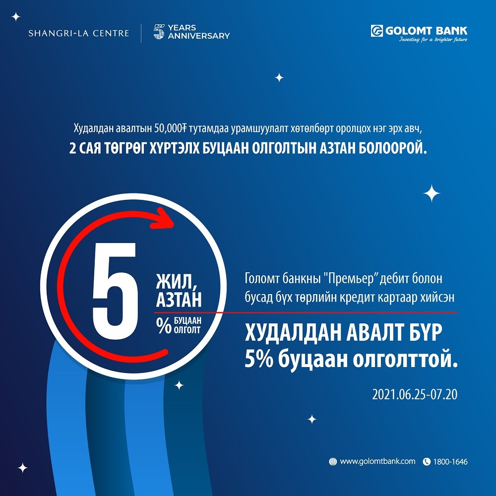 Шангри-Ла Төвийн 5 жилийн ойн баярын хүрээнд таван жилийн турш бидэнтэй хамт байсан үнэнч хэрэглэгч, үйлчлүүлэгчдээ урамшуулах зорилгоор “Голомт банк”-тай хамтран “5 ЖИЛ, 5 АЗТАН” буцаан олголттой урамшуулалт хөтөлбөрийг 2021.07.20-ыг дуустал зохион байгуулж байна.