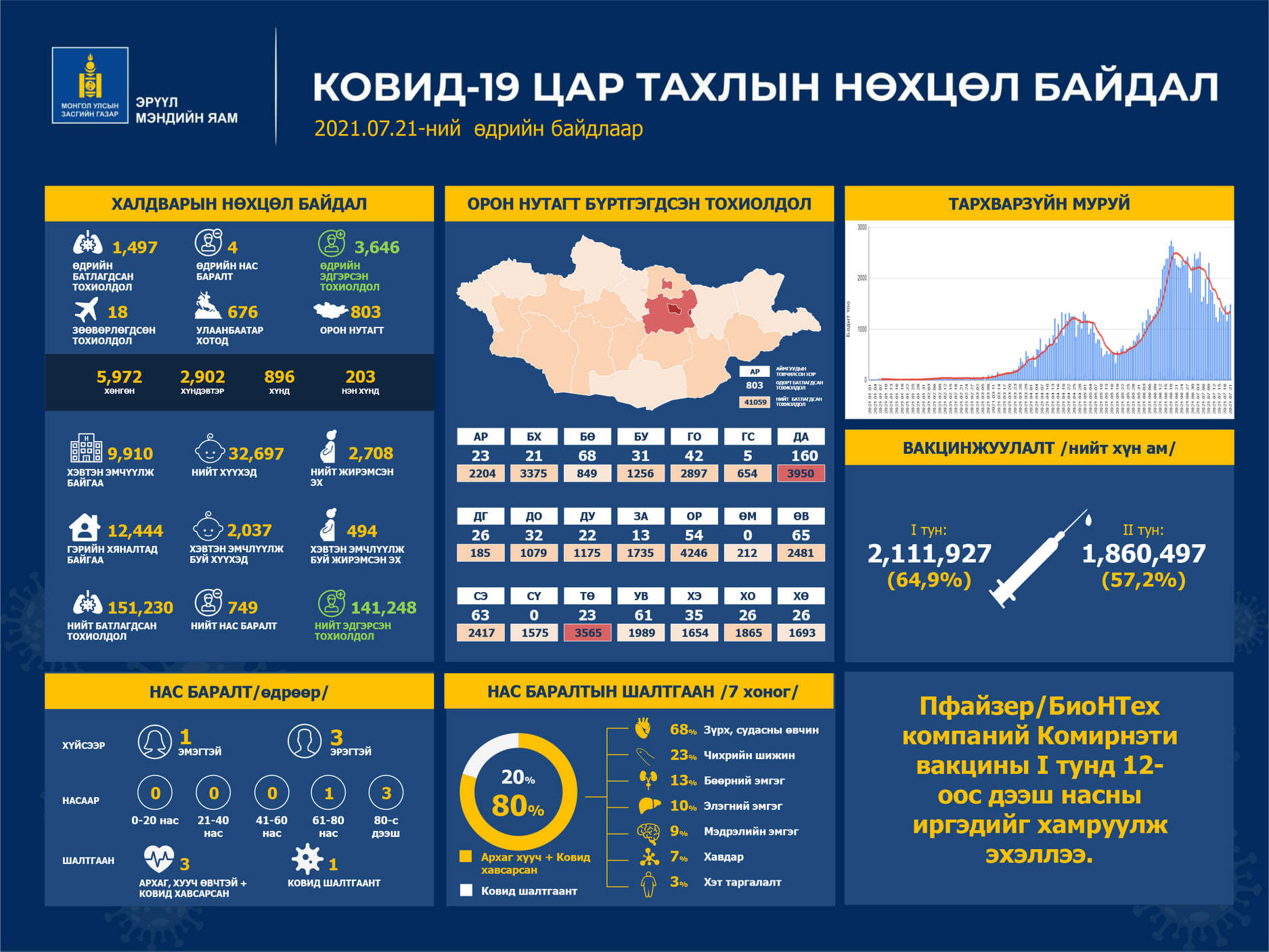 Эрүүл мэндийн яам коронавирусийн халдварын 2021 оны 07 дугаар сарын 21-ний өдрийн нөхцөл байдлыг мэдээлж байна. Энэ өдөр шинээр 1497 хүн халдвартай нь батлагдлаж, 61-80 насны дөрвөн иргэн нас баржээ. Шинээр илэрсэн тохиолдлуудын 676 нь Улаанбаатарт, 803 нь орон нутагт бүртгэгджээ. Мөн 18 тохиолдол нь зөөвөрлөгджээ.