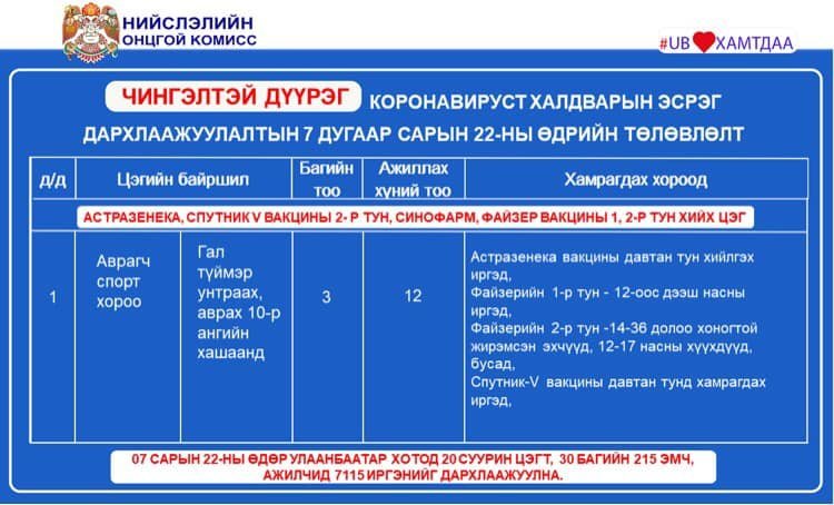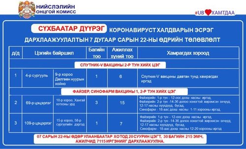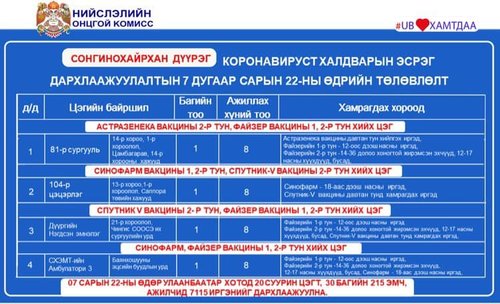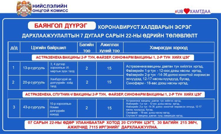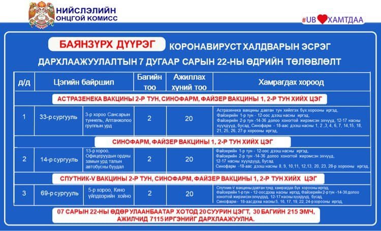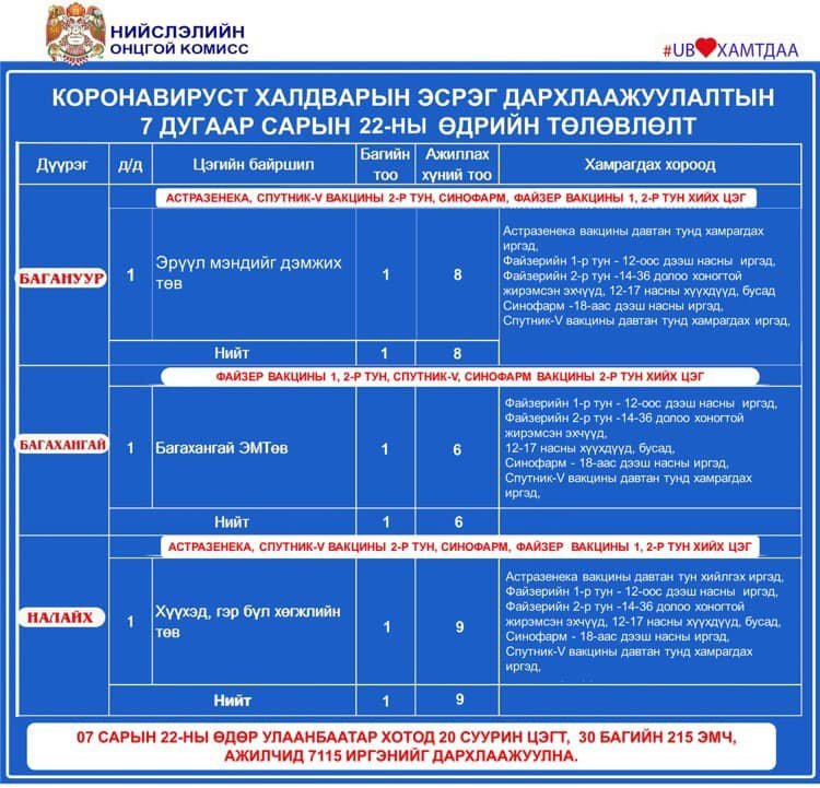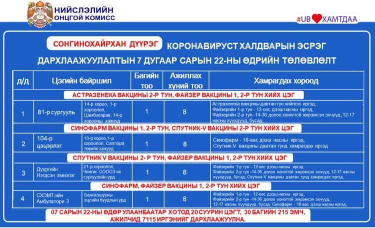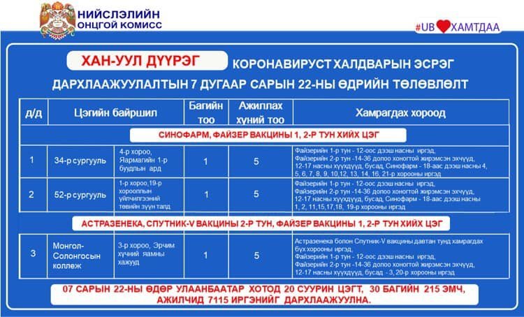 Өнөөдөр Улаанбаатар хотод суурин 20 цэгт 30 багийн 215 эмч, ажилтан ажиллаж, 7115 иргэнийг дархлаажуулахаар төлөвлөлөө. Дархлаажуулалтын цэгүүдийн мэдээллийг дүүрэг тус бүрээр танилцуулж байна.