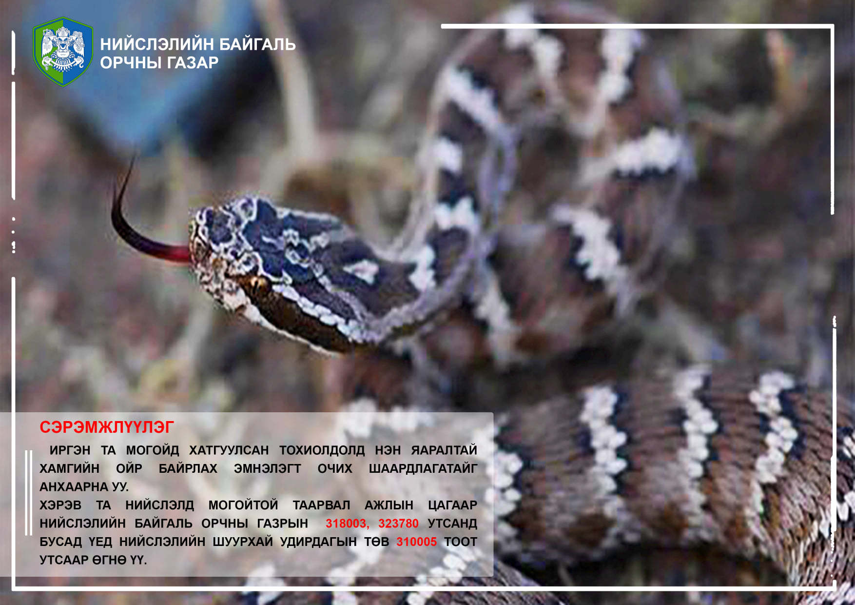 Могойд хатгуулсан тохиолдолд нэн яаралтай хамгийн ойр байрлах эмнэлэгт очих шаардлагатайг анхаарна уу. Хэрэв та нийслэлд энэхүү могойтой таарвал ажлын цагаар Нийслэлийн Байгаль орчны газар -ын утас 318003, 323780 бусад үед Нийслэлийн Шуурхай Удирдлагын Төв 310005 тоот утсаар өгнө үү ?
