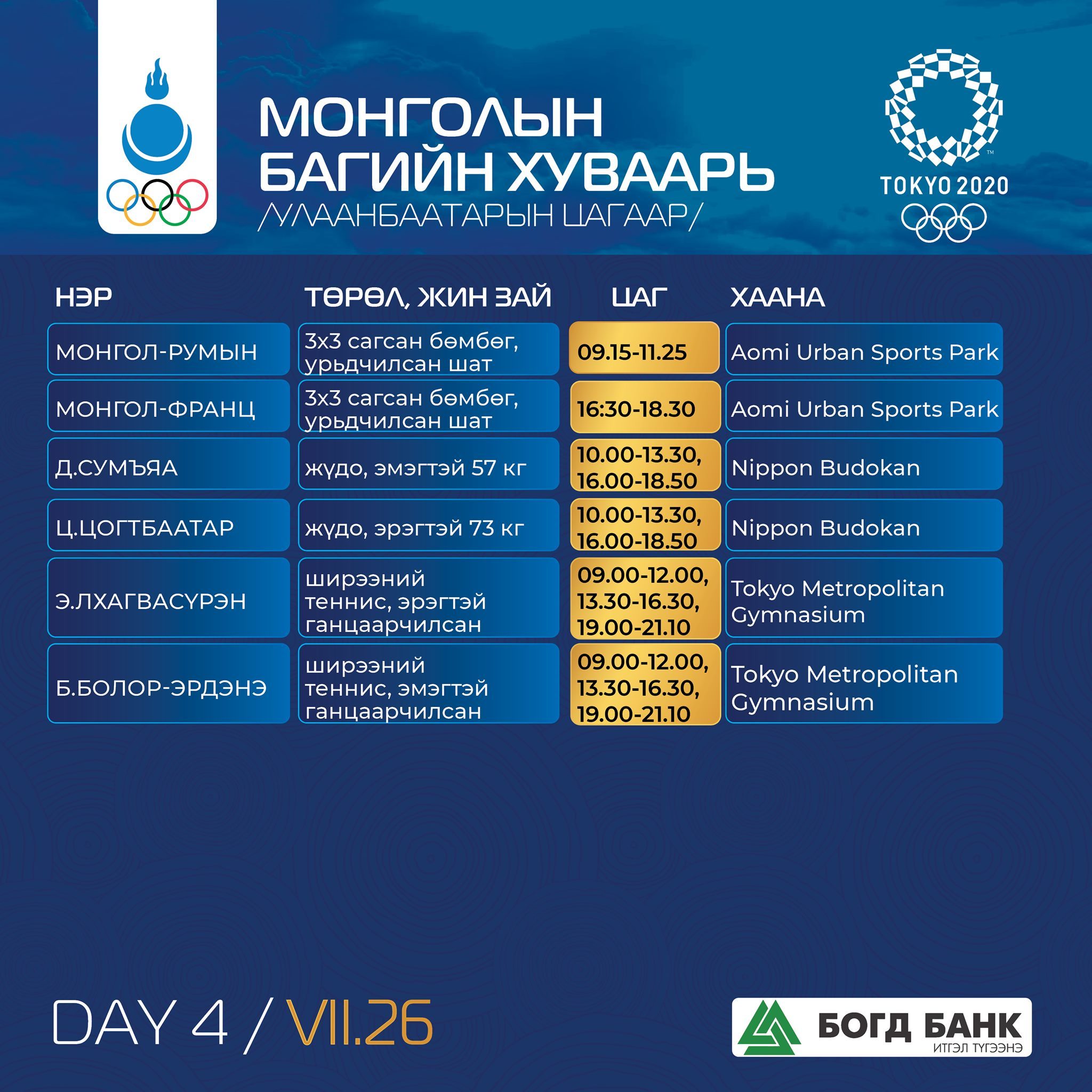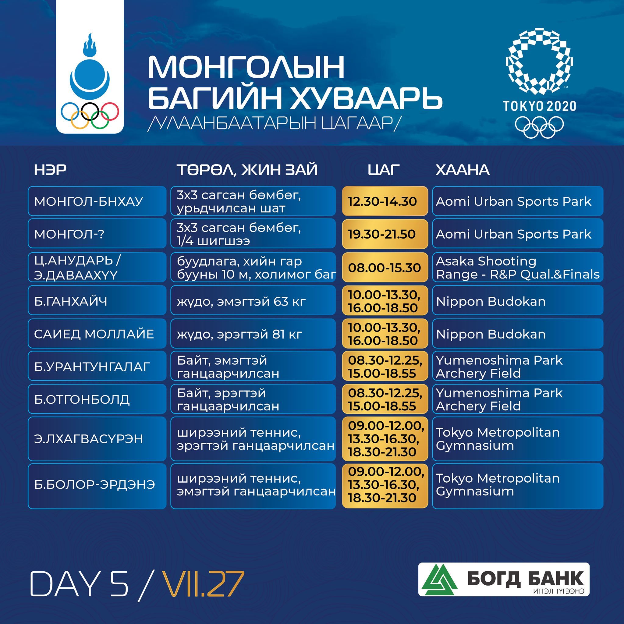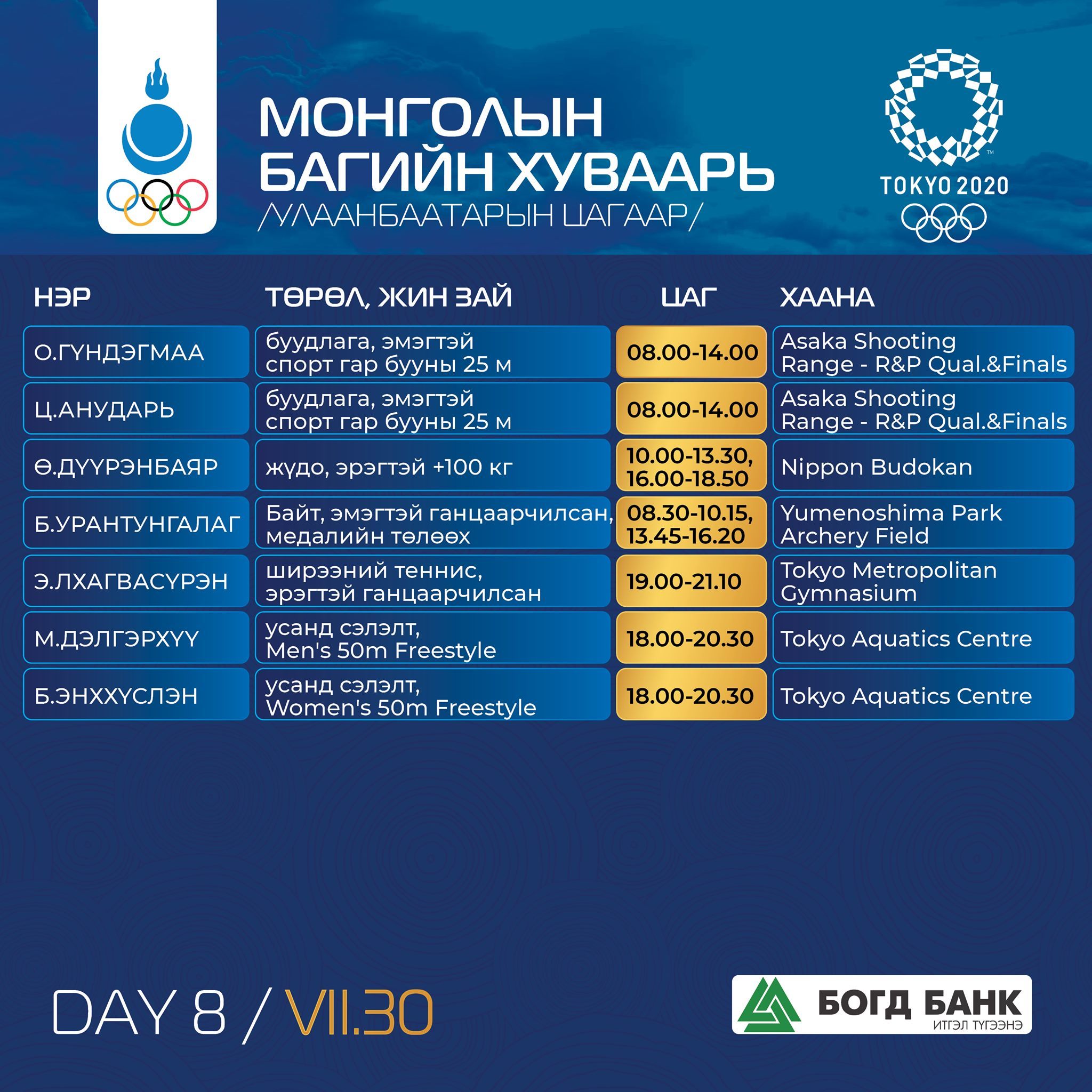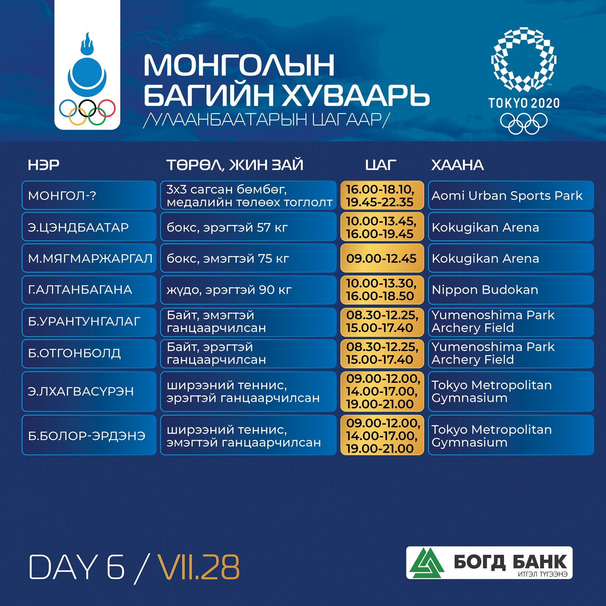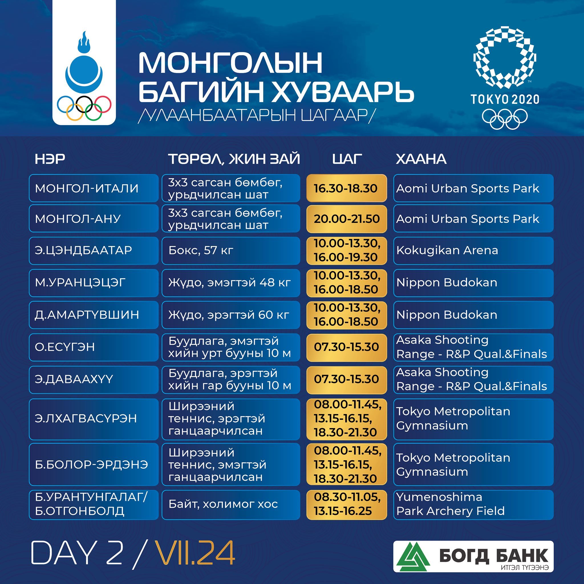 Токио-2020: Монголын баг тамирчдын тэмцээний хуваарь