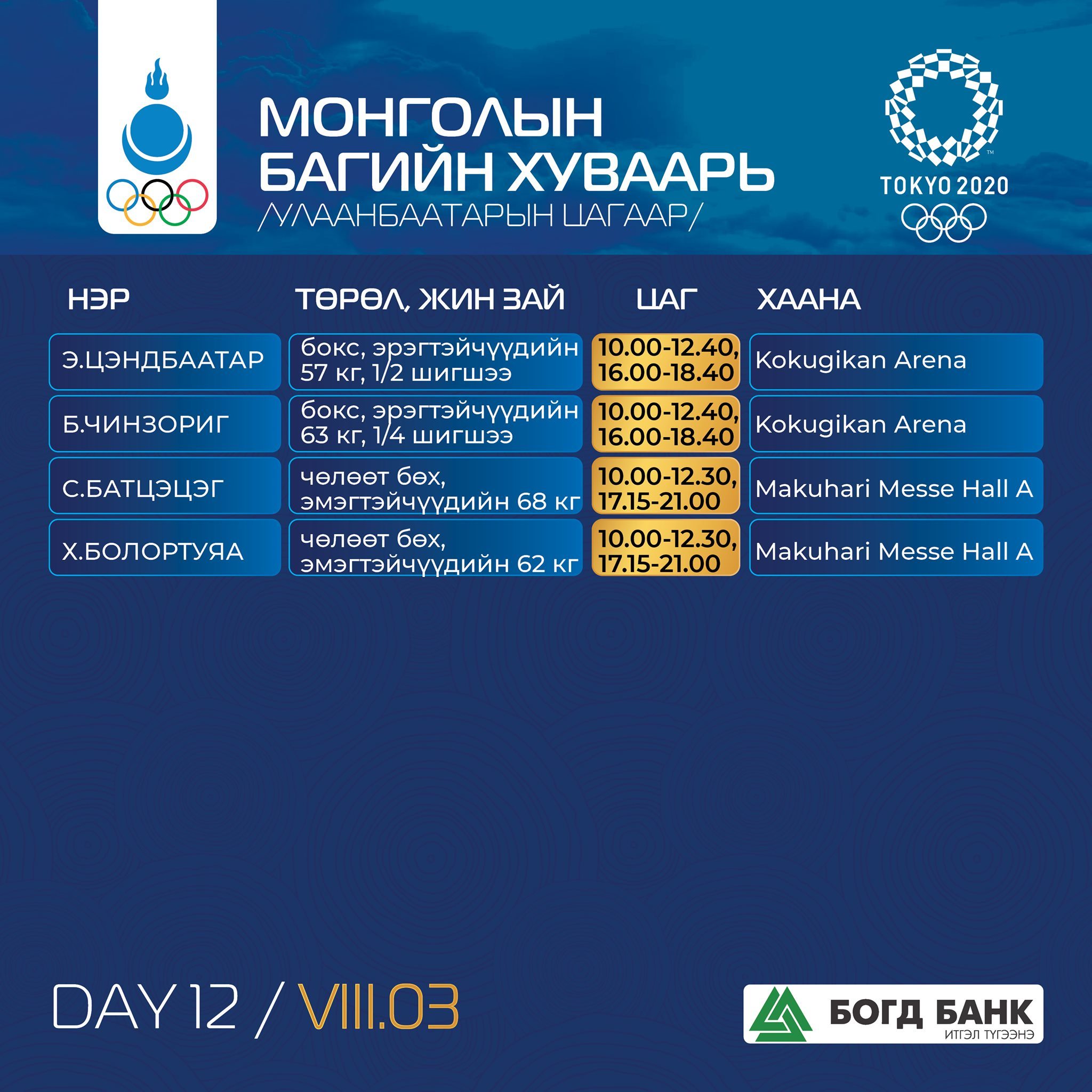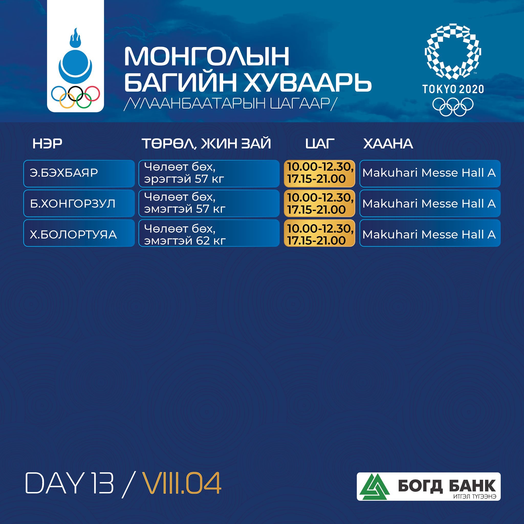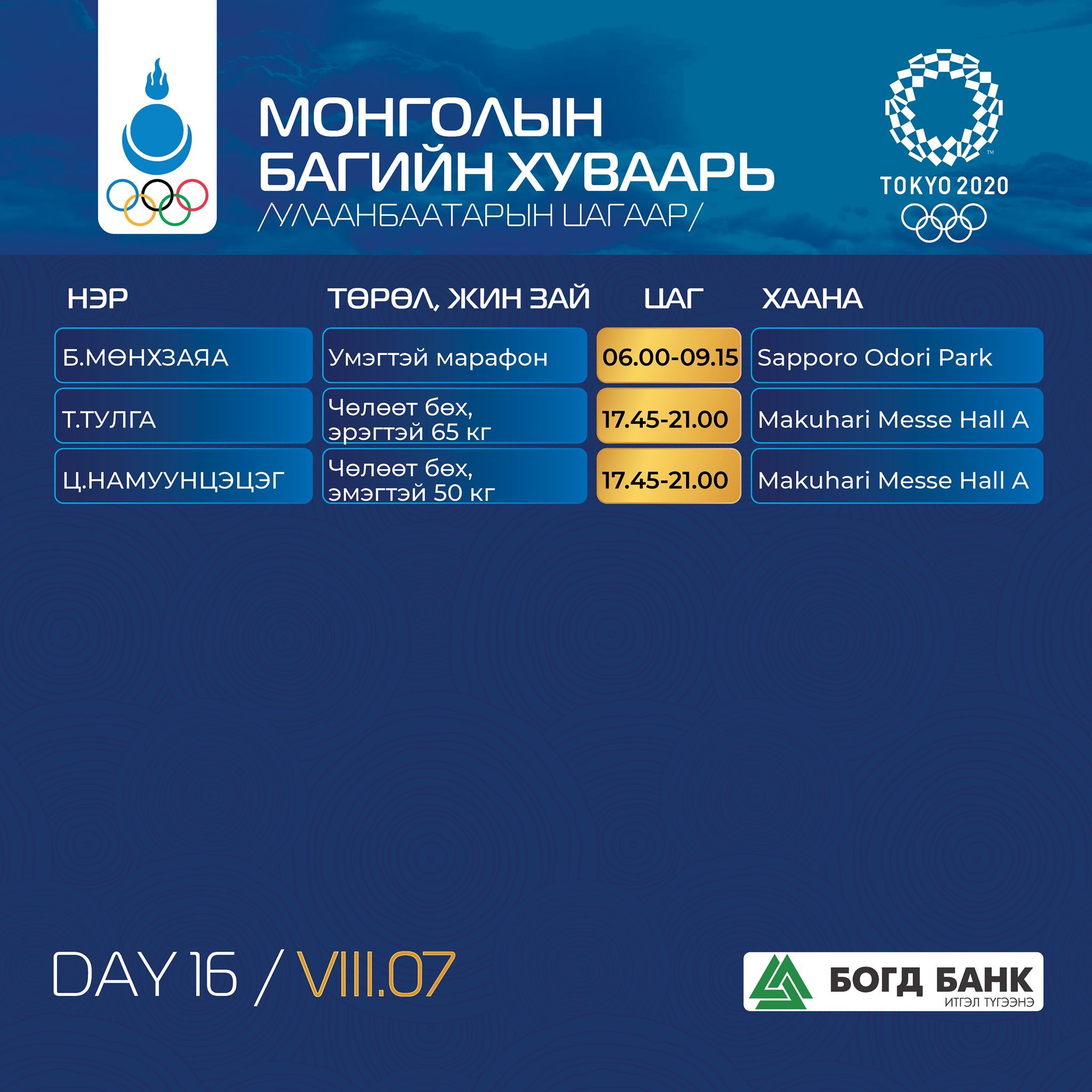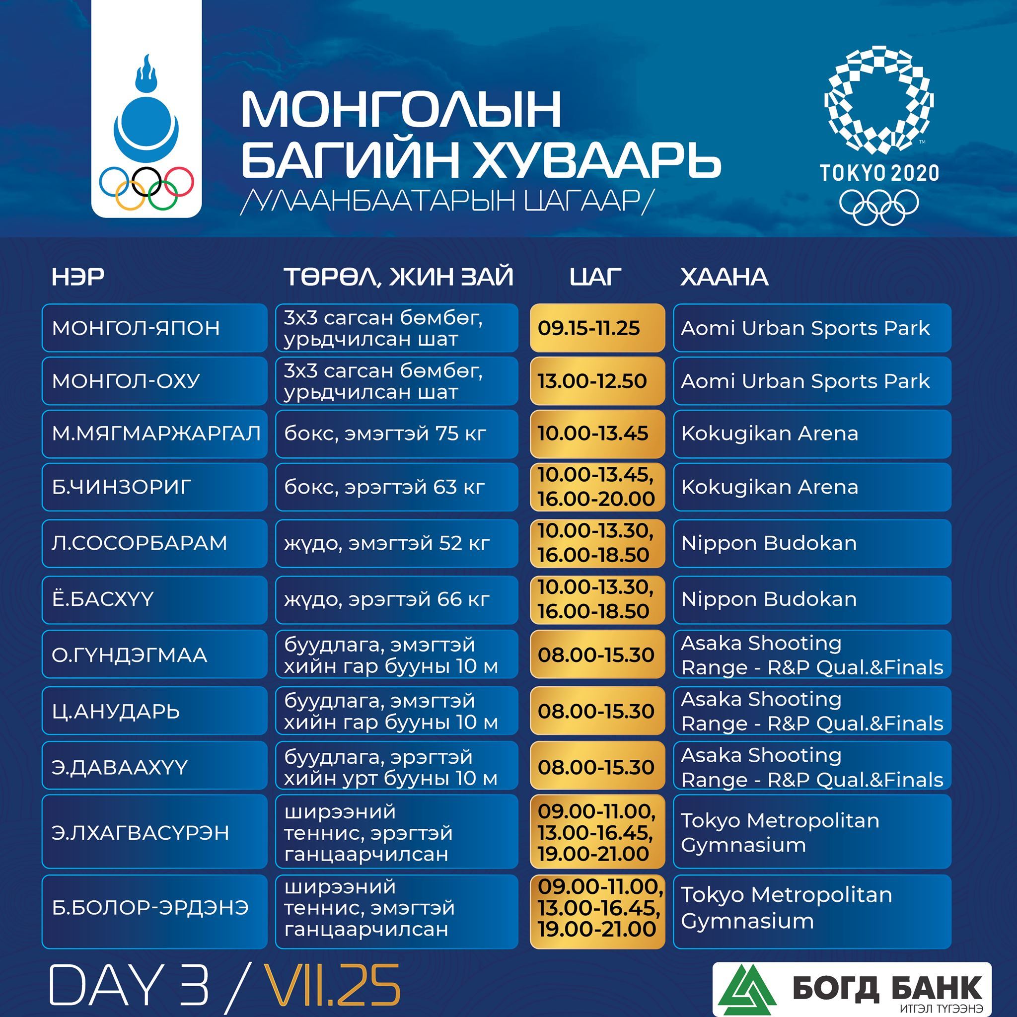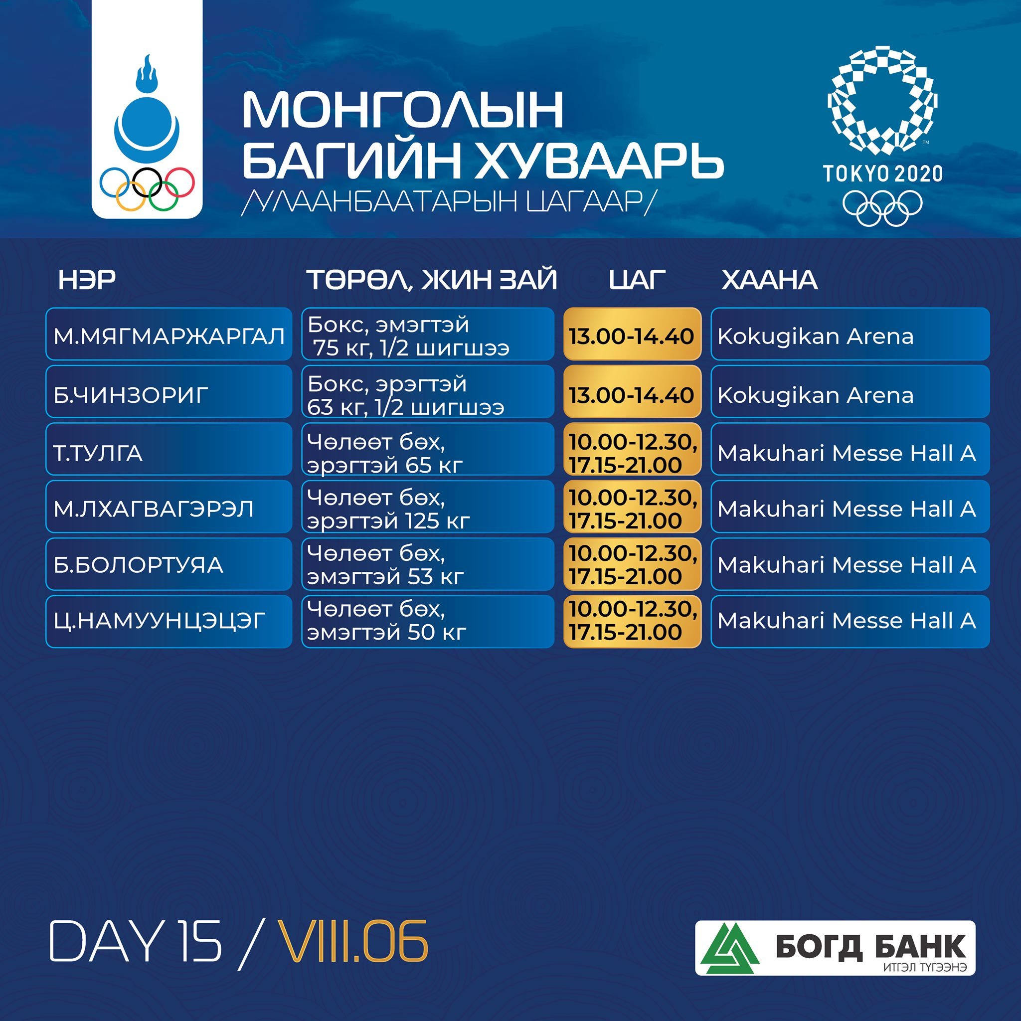 Токио-2020: Монголын баг тамирчдын тэмцээний хуваарь