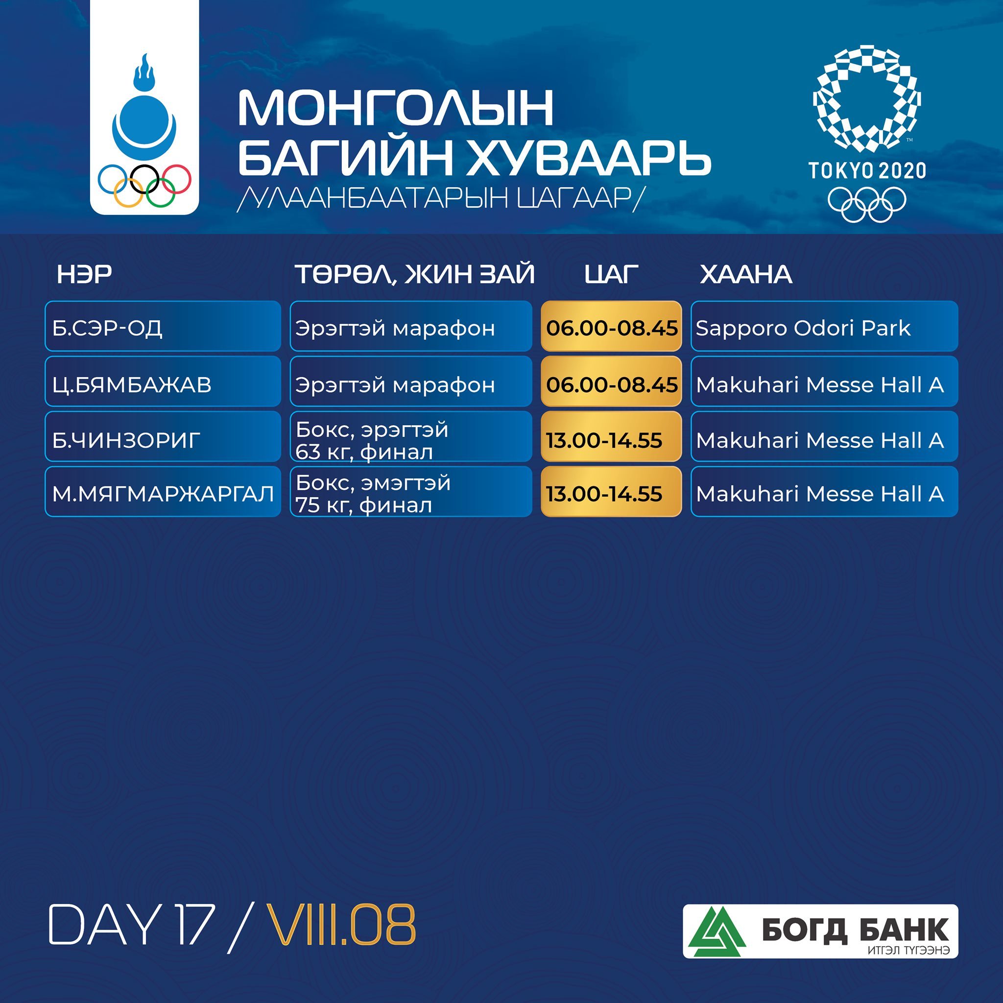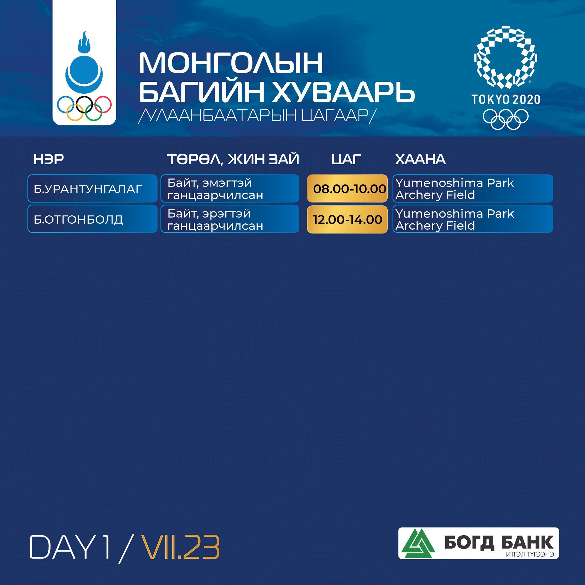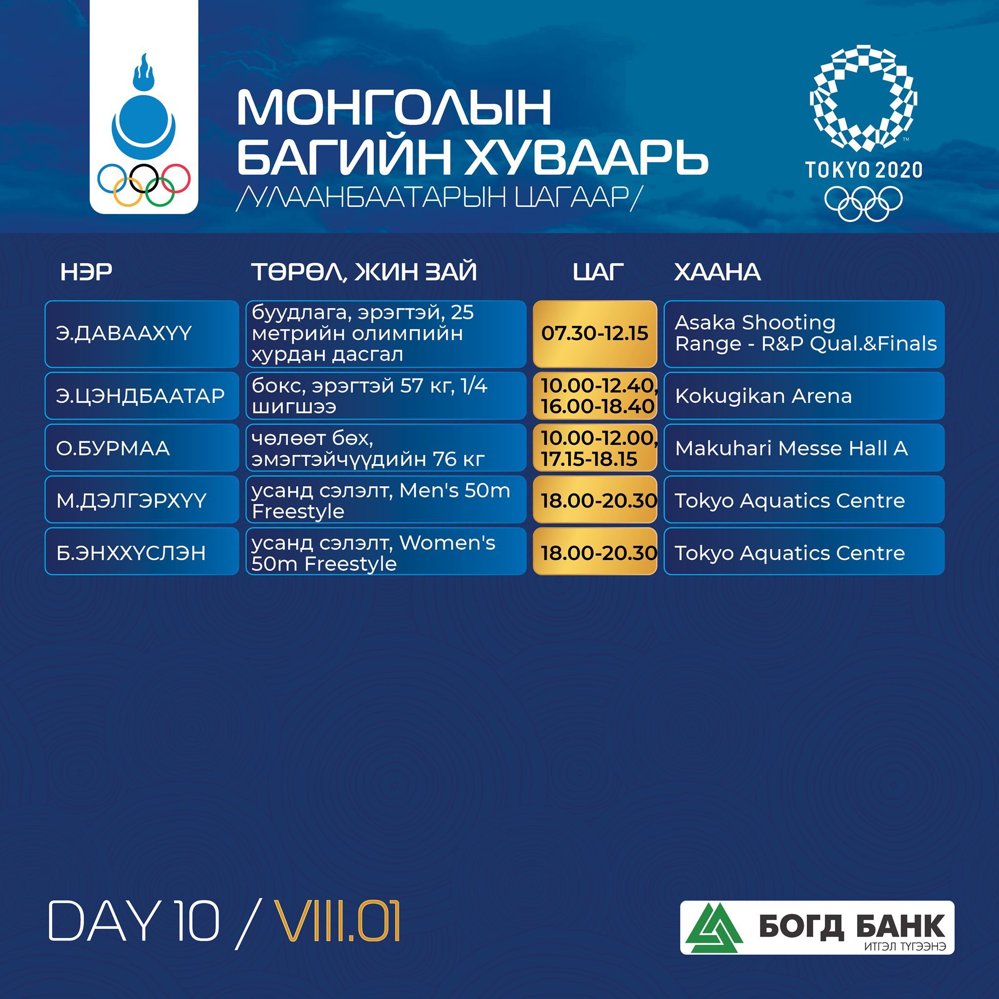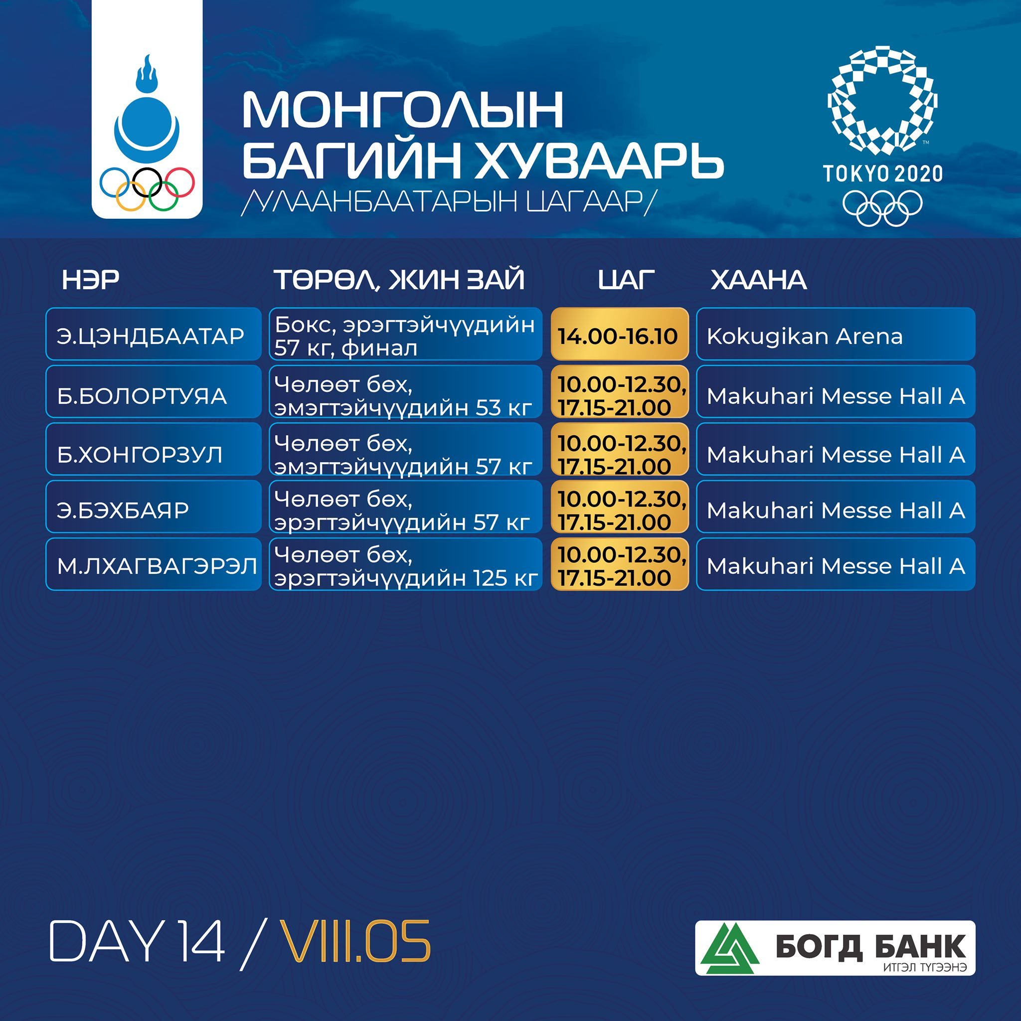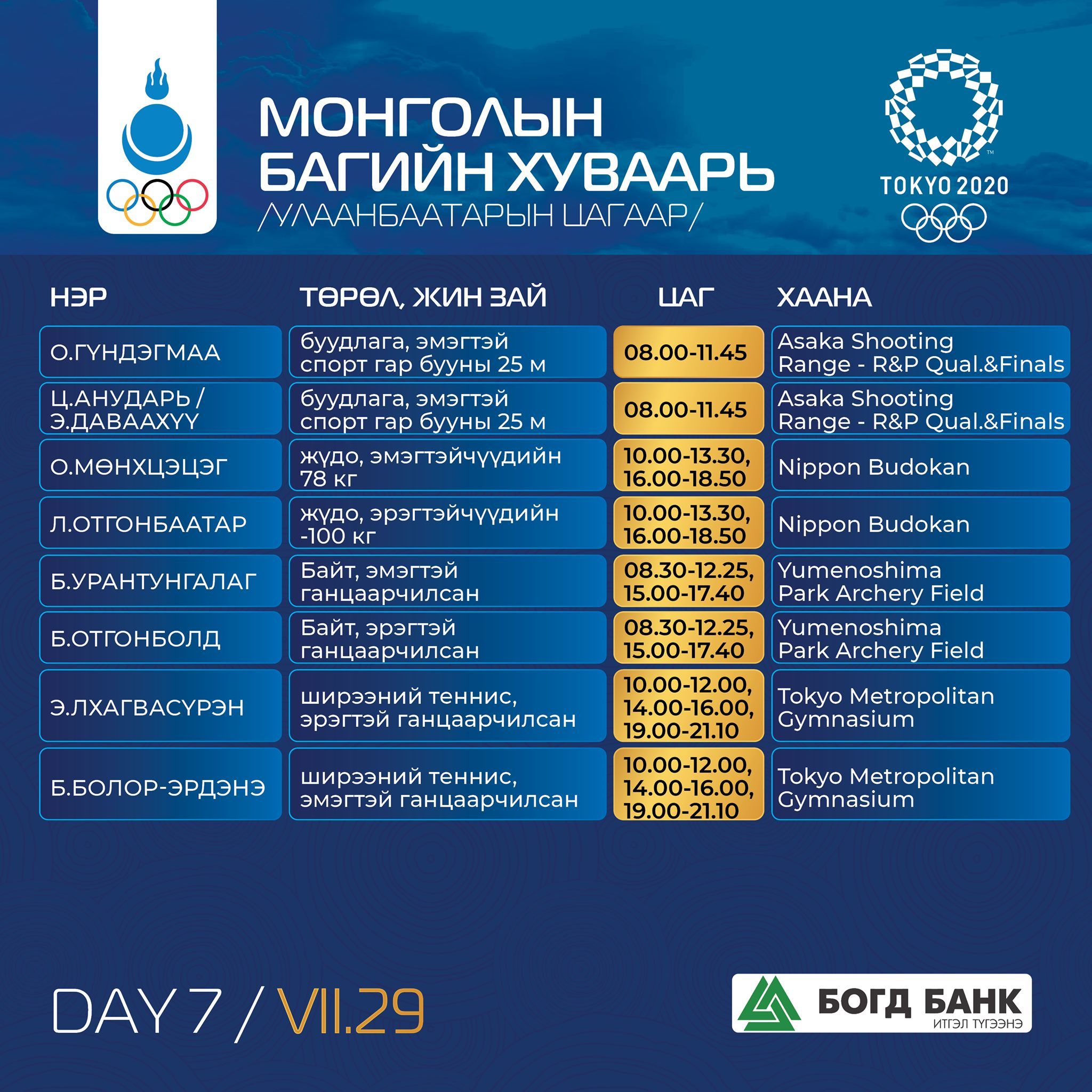Токио-2020: Монголын баг тамирчдын тэмцээний хуваарь