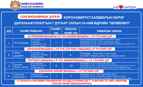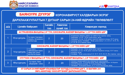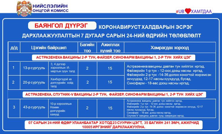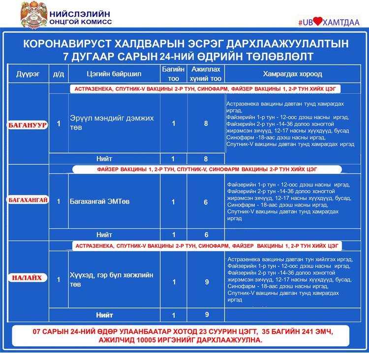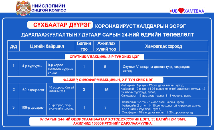 Өнөөдөр Улаанбаатар хотод суурин 23 цэгт 35 багийн 241 эмч, ажилтан ажиллаж, 10005 иргэнийг дархлаажуулахаар төлөвлөлөө. Дархлаажуулалтын цэгүүдийг дүүрэг тус бүрээр танилцуулж байна.
