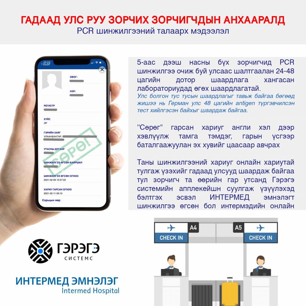 Өмнө нь Монгол улсаас гадаад руу зорчсон зорчигчдоос эерэг тохиолдол олон илэрч байгаагаас шалтгаалан mаны шинжилгээний хариуг нисэх буудал дахь бүртгэлийн цэгт дахин онлайнтай тулгах шаардлагатай болсон тул зорчигч та ГЭРЭГЭ системийг гар утсандаа суулгах эсвэл “Интермед” эмнэлэгт өгсөн бол интермэдийн онлайн системд шалгуулахад бэлтгэж ирэхийг анхааруулж байна.