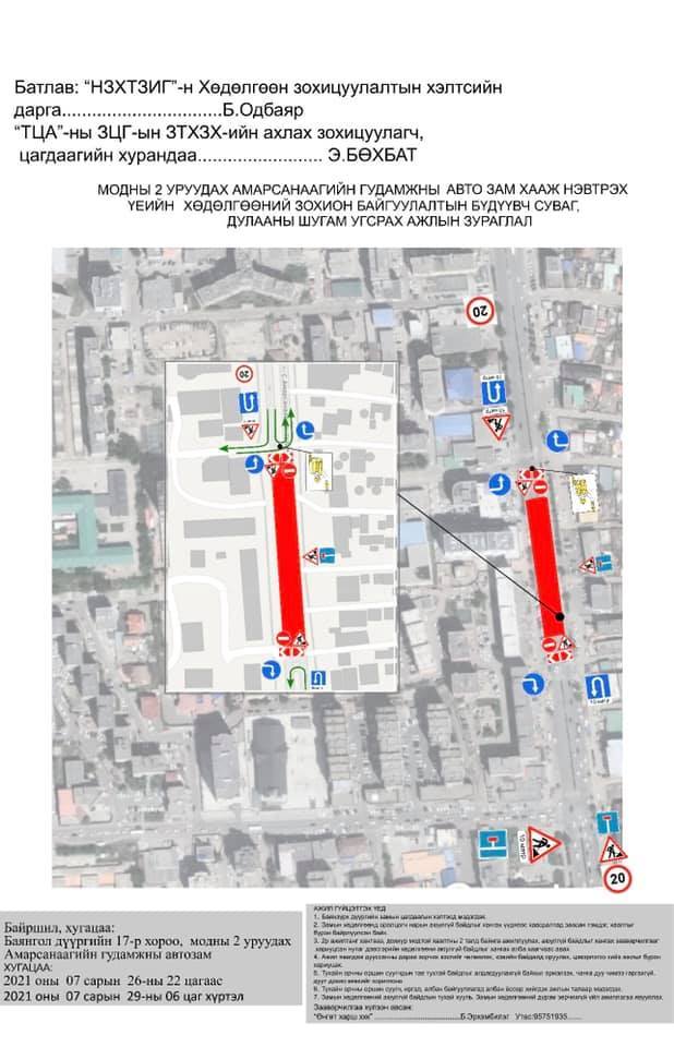 "Авто зам, тохижилт, ногоон байгууламжийг ашиглах хамгаалах журам”-ын дагуу Баянгол дүүргийн 17-р хороо Амарсанаагийн гудамж, Модны хоёроос уруудах авто замын суваг, дулааны шугам угсрах ажлыг 2021.07.26-ны 23:00 цагаас 07.29-ний 06:00 цагийн хооронд хийгдэнэ.