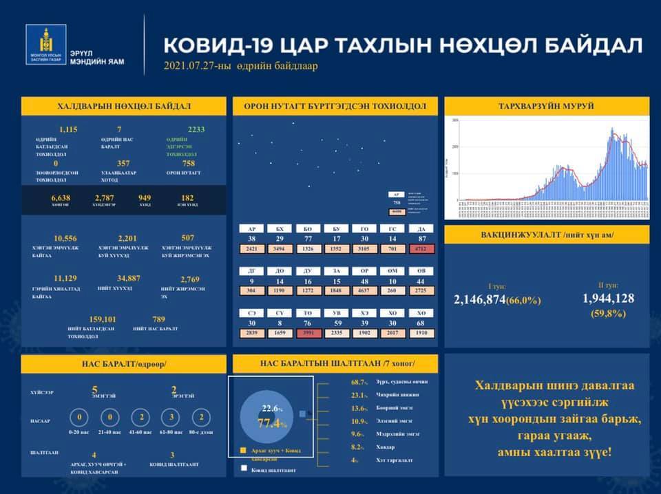 Энэ өдөр 1 115 шинэ тохиолдол батлагдаж, 40-80 насны 7 хүн нас баржээ. Нийт нас баралт 789 боллоо. Шинээр илэрсэн тохиолдлуудын 357 нь Улаанбаатарт бол 758 нь орон нутагт бүртгэгджээ.