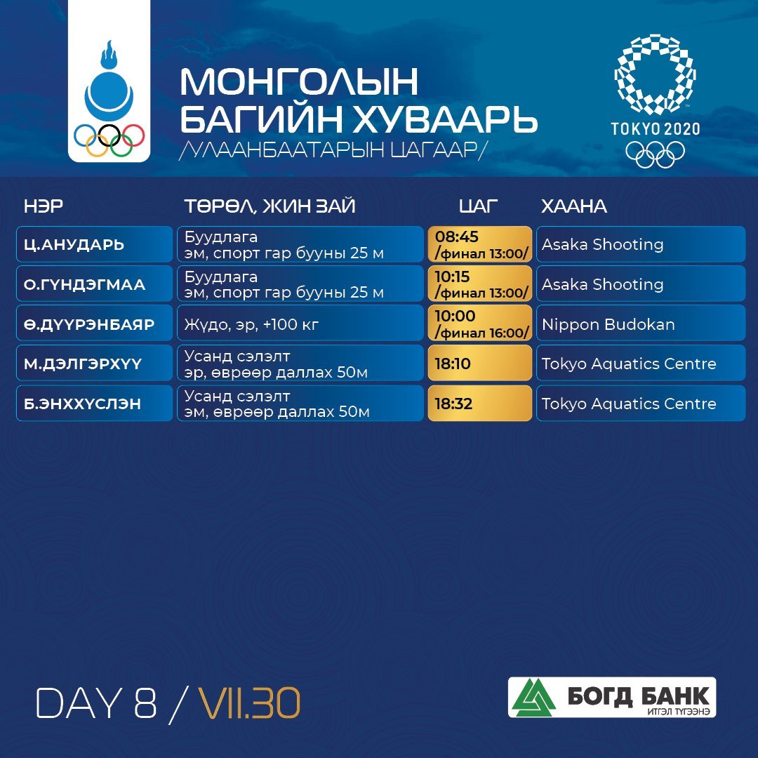Монголын баг тамирчдын өнөөдрийн хуваарийг танилцуулж байна. /Улаанбаатар хотын цагаар/ Монголын таван тамирчин спортын гурван төрөлд өрсөлдөнө.