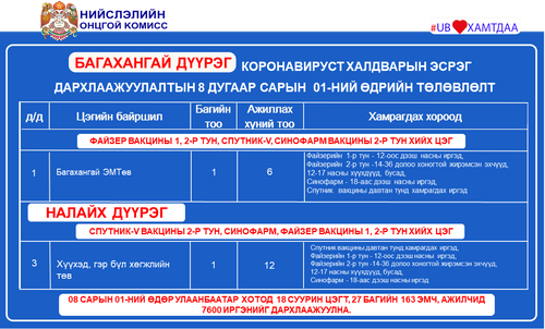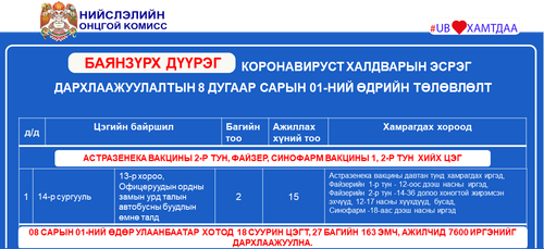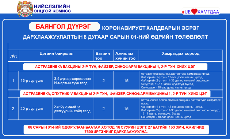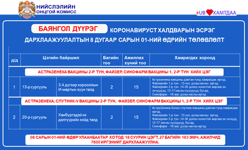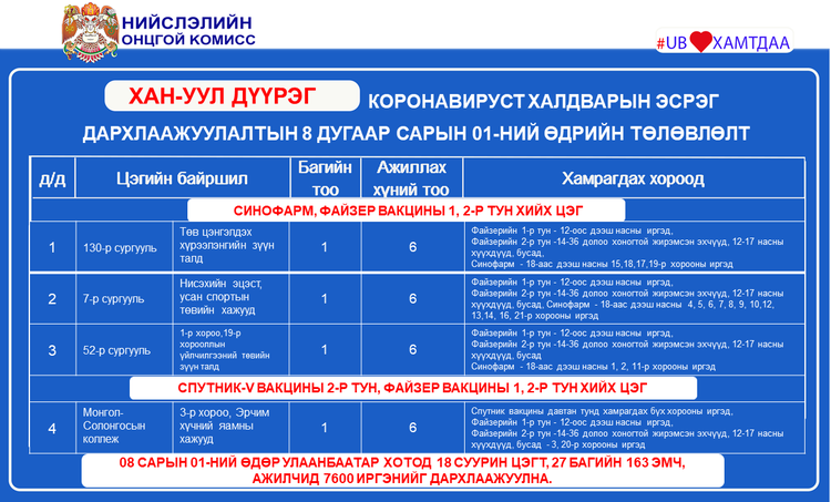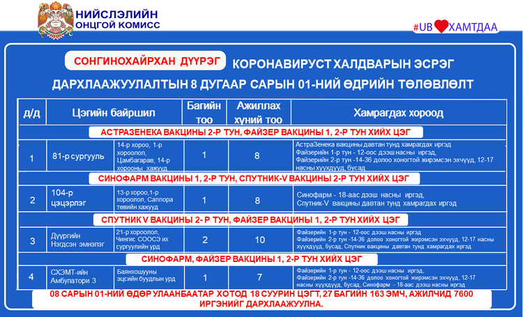 Өнөөдөр Улаанбаатар хотод суурин 18 цэгт 27 багийн 163 эмч, ажилтан ажиллаж, 7600 иргэнийг дархлаажуулахаар төлөвлөлөө. Дархлаажуулалтын цэгүүдийг дүүрэг тус бүрээр танилцуулж байна.