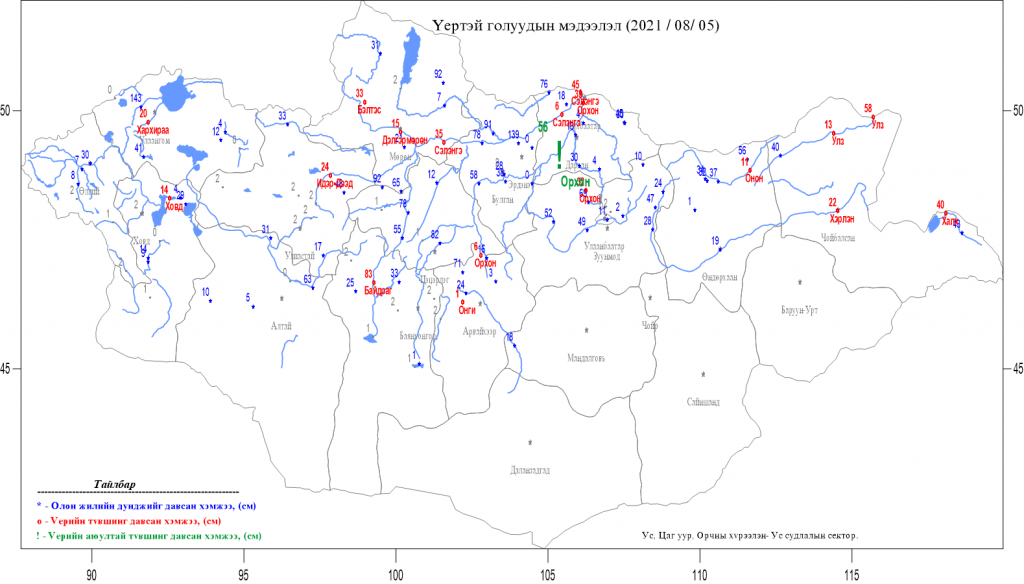 Цаг уурын байгууллагын ирүүлсэн мэдээллээр энэ сарын 05-ны өдрийн байдлаар Сэлэнгэ мөрний дунд болон адгаар Хөвсгөлийн уулсаас эхтэй Эг Хангай нурууны өврийн Завхан арын Идэр, Чулуут, Урдтамир, Хойдтамир Хэнтий нурууны баруун хажуугаас усжих Туул, Орхон голын усны түвшин өмнөх өдрийнхөөс 10-65 см нэмэгдэж Сэлэнгэ, Бэлтэс, Бүгсий Идэр, Хэрлэн, Онон, Улз, Байдраг, Онги, Халх, Хархираа, Ховд голууд үерийн түвшинг 5-80 см давсан байна.Харин Орхон гол Орхонтуул сум орчмоор үерийн аюултай түвшинг 56 см даван хүчтэй үерлэж байна.