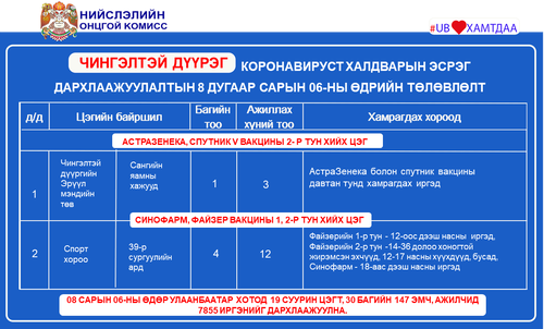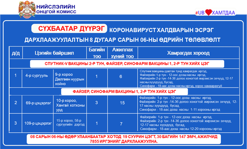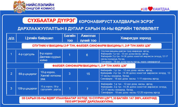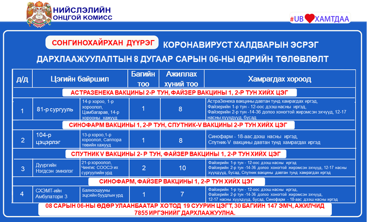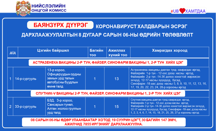 Өнөөдөр Улаанбаатар хотод суурин 19 цэгт 30 багийн 147 эмч, ажилтан ажиллаж, 7855 иргэнийг дархлаажуулахаар төлөвлөлөө. Дархлаажуулалтын цэгүүдийг дүүрэг тус бүрээр танилцуулж байна.