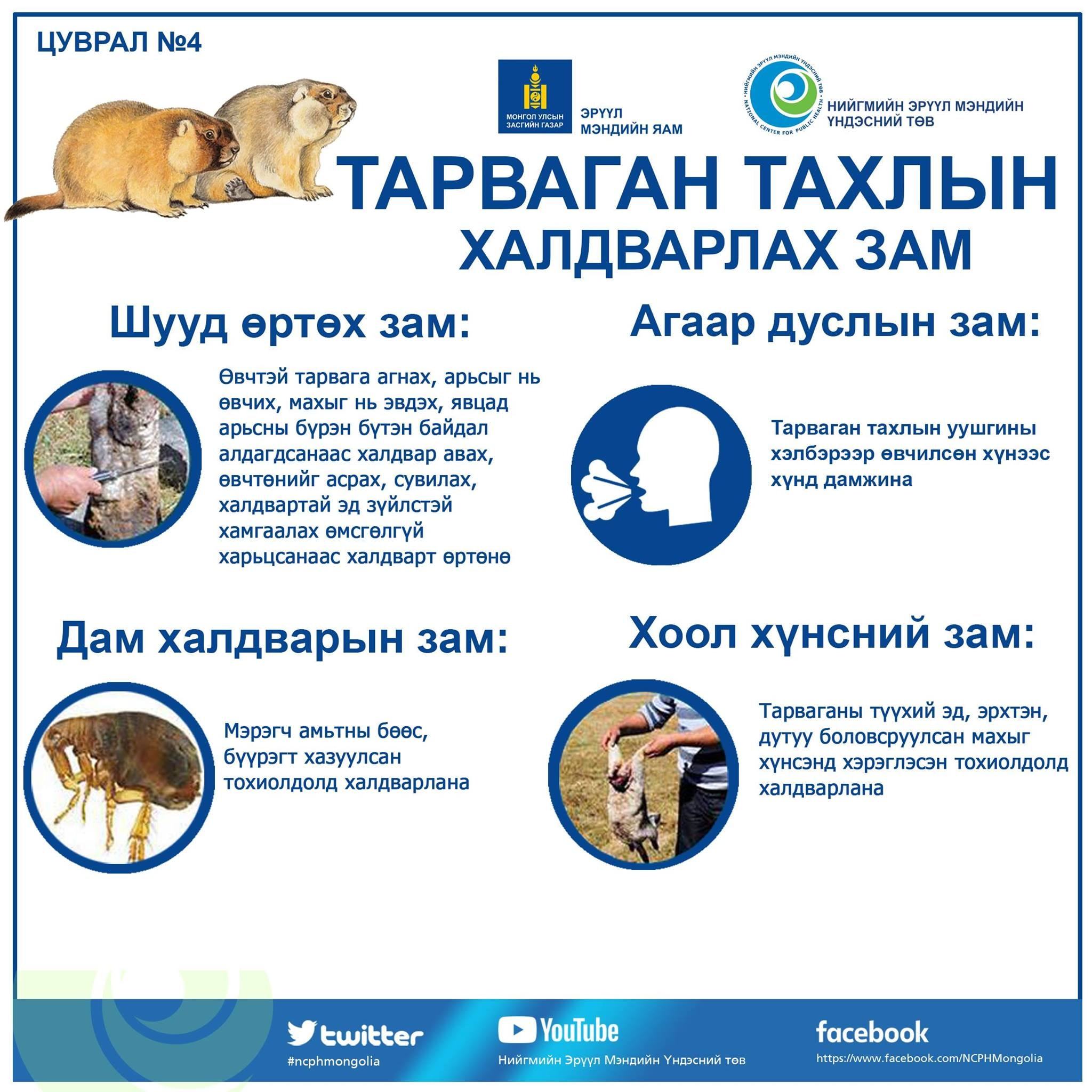 Эрүүл мэндийн яамнаас тарваган тахал өвчин гарах “маш өндөр” эрсдэлтэй аймгуудыг танилцуулжээ. Тодруулбал, Увс, Баян-Өлгий, Завхан, Ховд, Говь-Алтай, Архангай, Хөвсгөл, Баянхонгор, Өвөрхангай, Дорноговь аймагт тарваган тахал халдвар гарах эрсдэл өндөр байгаа аж. Тиймээс иргэд та бүхэн анхаарал болгоомжтой байж, тарвага агнахгүй, хүнсэнд хэрэглэхгүй байхыг анхааруулж байна.