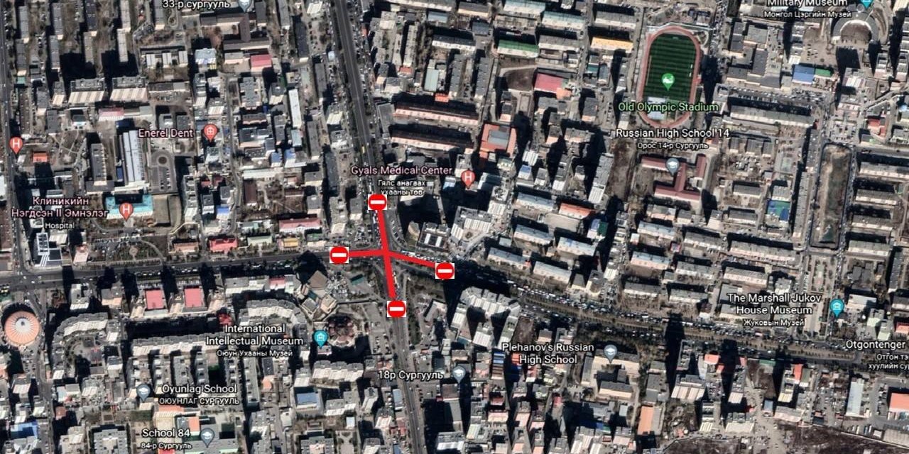 - Наймдугаар сарын 12-ны 23:00 цагаас наймдугаар сарын 16-ны 23:00 цаг хүртэл Зүүн дөрвөн замын уулзварын хөдөлгөөнийг