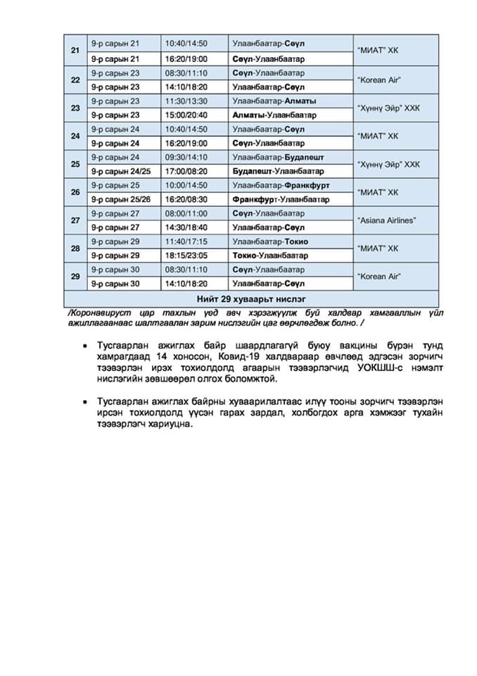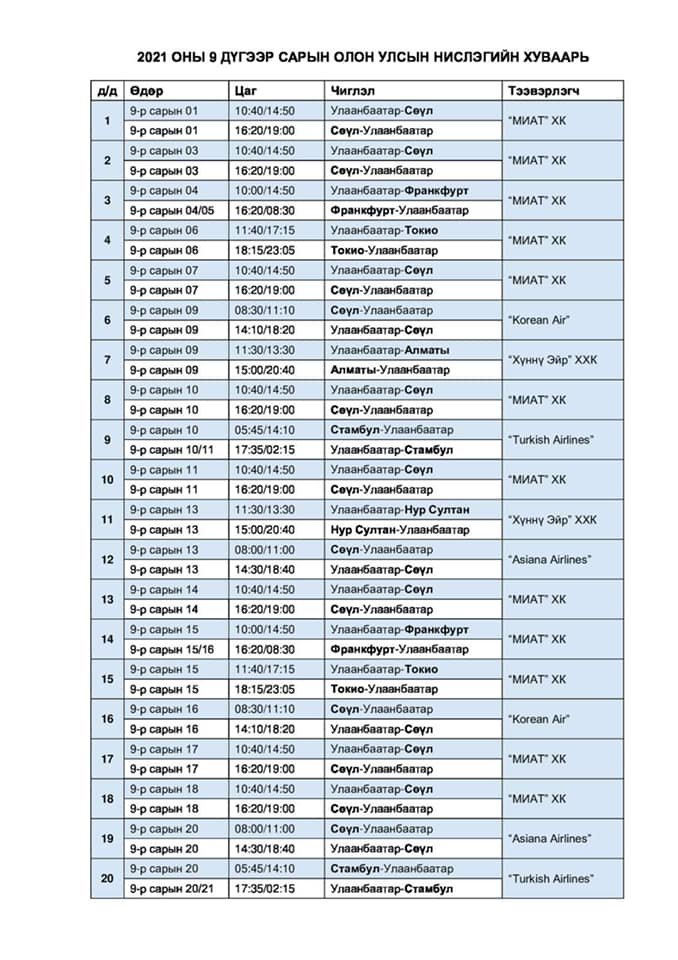 Иргэний нисэхийн ерөнхий газраас ирэх есдүгээр сарын нислэгийн хуваарийг танилцууллаа. Ирэх сард нийт 29 удаагийн тусгай нислэг үйлдэхээр төлөвлөсөн байна. Гадаадаас ирэх иргэд нислэгийн хуваарийн дагуу тасалбар захиалахдаа агаарын тээвэрлэгчдэд шууд хандана.