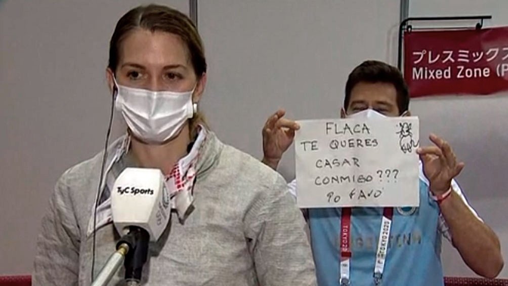 Тамирчин бүсгүй сэтгүүлчидтэй ярилцах үеэр араас нь түүний дасгалжуулагч Лукас Сауседо сэмхэн гарч иржээ. Тэрбээр "Чи надтай гэрлэх үү??? Гуйж байна" гэсэн бичиг гартаа барьсан байна.