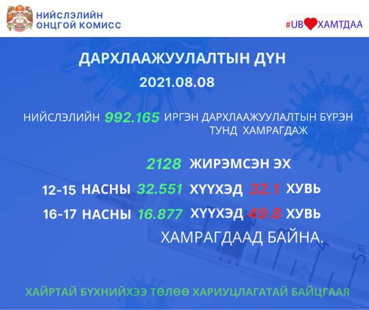 Өчигдөр буюу наймдугаар сарын 08-нд нийслэлийн хэмжээнд I тунд 517, II тунд 240, нийт 757 иргэнийг дархлаажуулжээ. Вакцинжуулалт эхэлснээс хойш нийслэлийн 18-аас дээш насны 1.091.782 иргэн I тунд, 992.165 иргэн II тунд хамрагдаад байна. Мөн нийт 2128 жирэмсэн эх, 12-15 насны 32.551 /32.1%/, 16-17 насны 16.877 /49.8%/ хүүхэд тус тус II тунд хамрагдсан аж.
