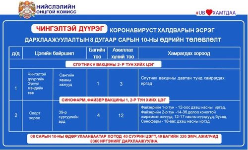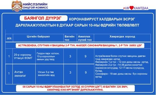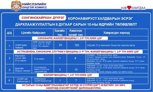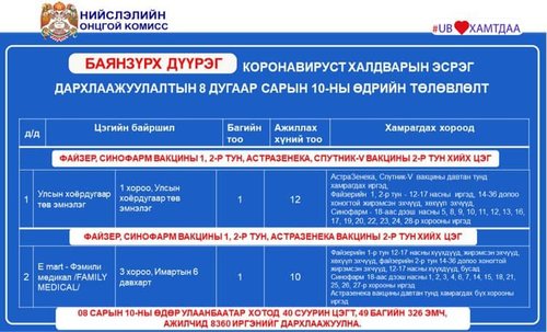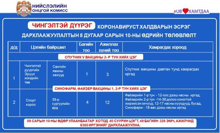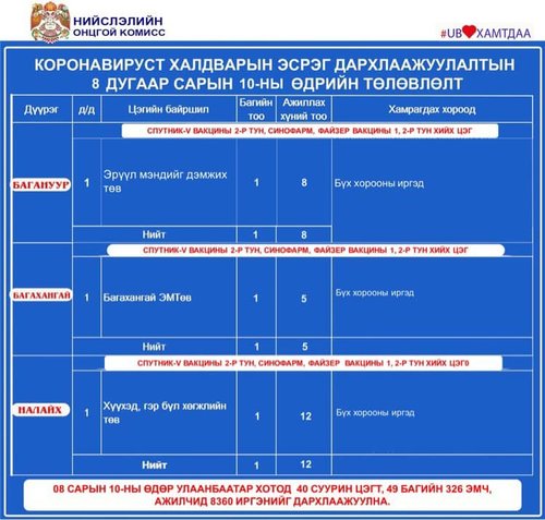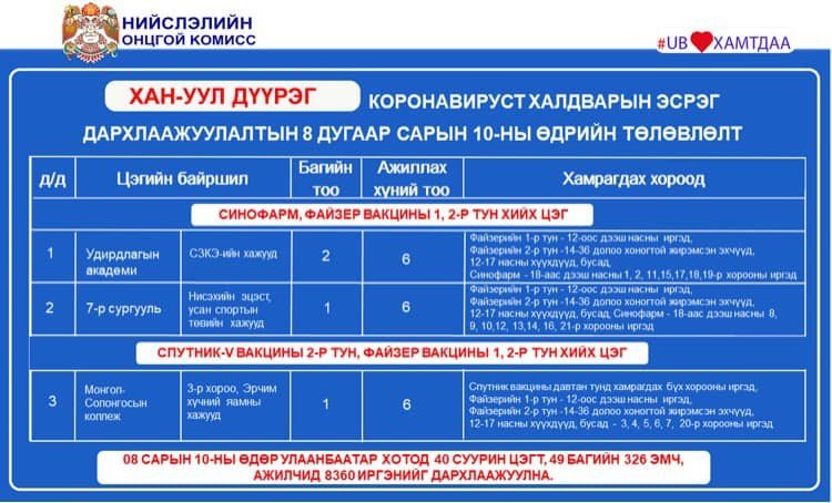 Өнөөдөр Улаанбаатар хотод суурин 40 цэгт 49 багийн 326 эмч, ажилтан ажиллаж, 8360 иргэнийг дархлаажуулахаар төлөвлөлөө. Дархлаажуулалтын цэгүүдийг дүүрэг тус бүрээр танилцуулж байна.