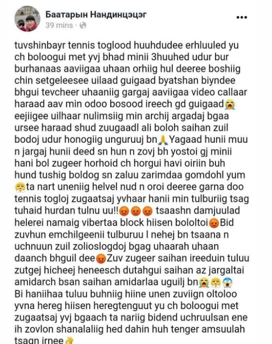 Тэрбээр, "Н.Түвшинбаяр теннис тоглоод хүүхдүүдээ эрхлүүлээд юу ч болоогүй мэт явж байхад миний гурван хүүхэд өдөр бүр бурханаас аавыгаа ухаан орохыг, хөл дээрээ босохыг чинь сэтгэлээсээ уйлаад гуйгаад бяцхан биендээ байхгүй тэвчээр ухааныг гаргаж аавыгаа хараад аав минь одоо босоод ирээч гээд гуйгаад ээжийгээ уйлахаар нулимсыг минь арчиж, аргадаж байгаа үрсээ хараад шүд зуугаад л аль болох сайхан зүйл бодож өдөр хоногийг өнгөрөөж байна. Яагаад хүний муу нь жаргаж хүний дээд сайн хүн нь зовж байх ёстой гэж. Миний хань бол зүгээр хорхойд ч хоргүй хавь ойрын бүх хүнд туслахыг боддог сайн залуу. Заримдаа гомдох л юм. Та нарт үнэнийг хэлбэл нүд нь орой дээрээ гарна даа. Теннис тоглож зугаацаж явахаар эмчилгээний төлбөрийг цаг тухайд хурдан төлнө үү. Цааш нь дамжуулаад хэлээрэй. Намайг viber блок хийсэн бололтой. Бид зөвхөн эмчилгээний төлбөрөө л нэхэж байна. Цаана нь өчнөөн зүйл золиослогдож байгааг ухаарах ухаан даан ч байхгүй л дээ. Зөв зүгээр сайхан ирээдүйн төлөө зүтгэж хичээж хэнээ ч дутахгүй сайхан аз жаргалтай амьдарч байсан сайхан амьдралаа үгүйлж байна. Би ханийхаа төлөө бүхнийг хийнэ. Үнэн зөвийг нь олтлоо явна. Хэрэг хийсэн хэрэгтнүүд юу ч болоогүй мэт зугаацаж явж байгаа ч та нарыг бидэнд учруулсан энэ их зовлон шаналлыг хэд дахин хөх тэнгэр амсуулах цаг ирнэ" гэжээ.