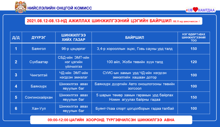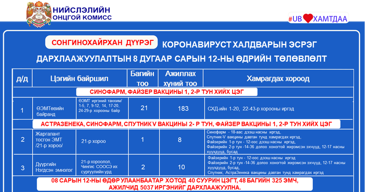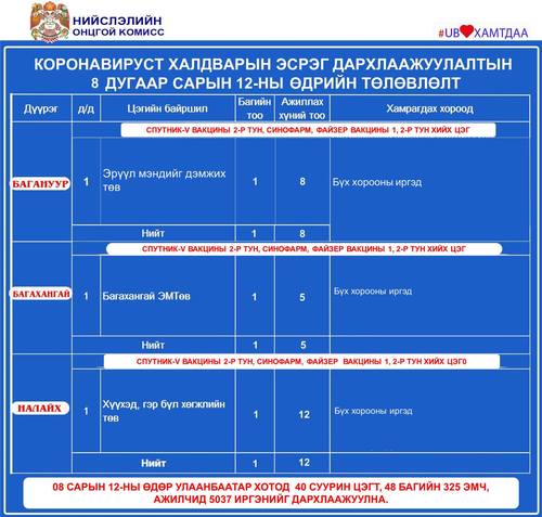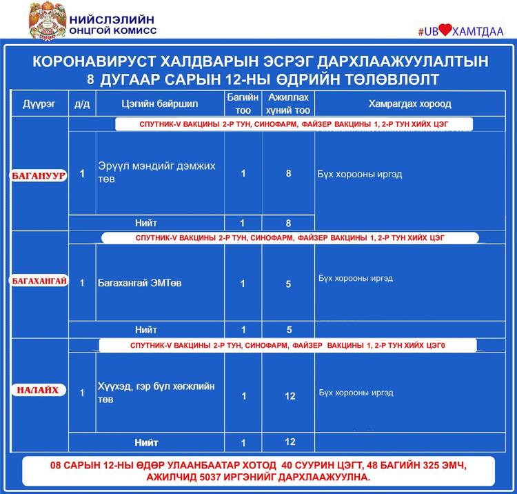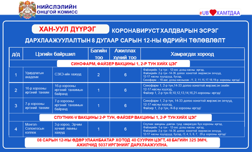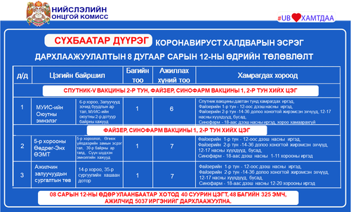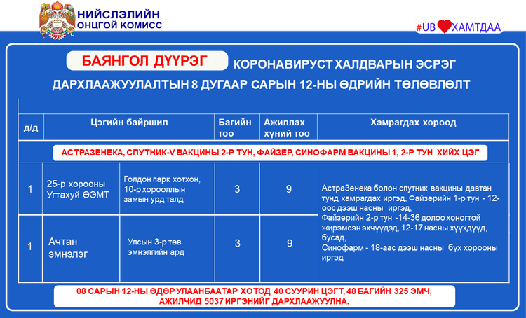 Өнөөдөр Улаанбаатар хотод суурин 40 цэгт 48 багийн 325 эмч, ажилтан ажиллаж, 5037 иргэнийг дархлаажуулахаар төлөвлөжээ. Та бүхэнд шинжилгээний болон дархлаажуулалтын цэгүүдийг дүүрэг тус бүрээр танилцуулж байна.