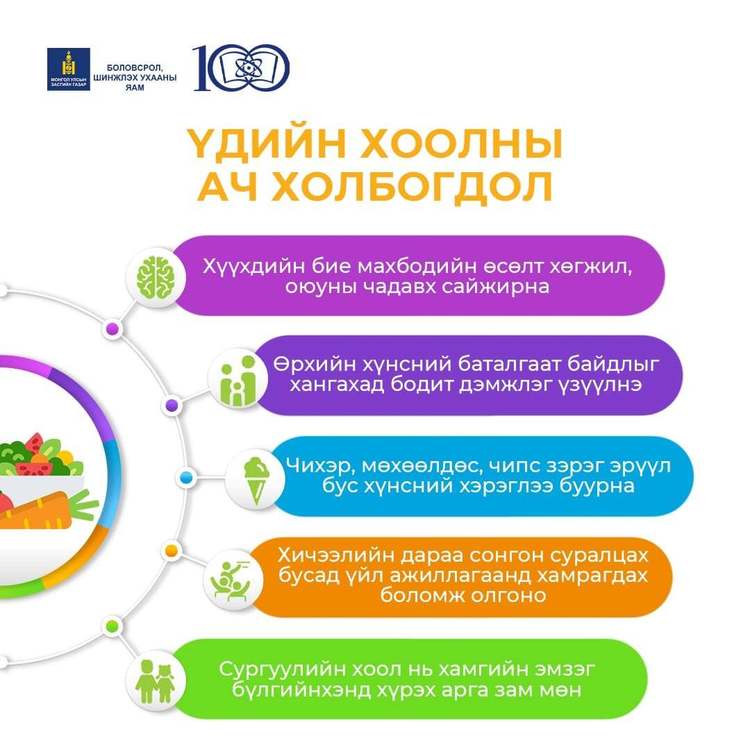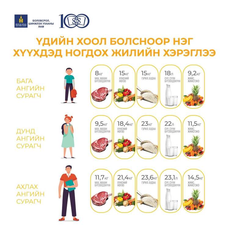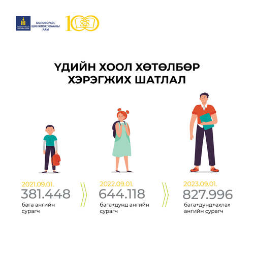 Энэ оны 9 дүгээр сарын 1-ний өдрөөс бага ангийн сурагчдыг Үдийн хоолны үйлчилгээнд хамруулж, тэдний нас биеийн онцлогт тохирсон эрүүл, шим тэжээллэг хоол хүнсийг тэнцвэртэйгээр хүргэх боломж бүрдлээ. Засгийн газрын хуралдаанаас шийдвэр гарснаар