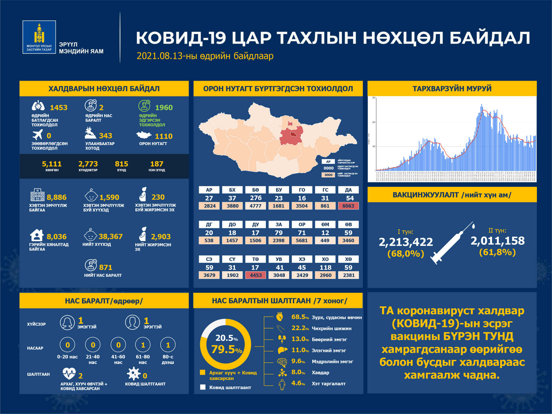 ЭМЯ-наас коронавирусийн халдварын нөхцөл байдлын мэдээллийг гаргажээ. Энэ өдөр шинээр 1453 тохиолдол бүртгэгджээ. Шинээр батлагдсан тохиолдлын 343 нь Улаанбаатар хотод, 1110 нь орон нутагт, байна. Мөн хугацаанд халдварын улмаас орон нутагт хоёр хүн нас баржээ. Түүнчлэн сүүлийн 24 цагийн хугацаанд 1960 хүн эдгэрлээ.