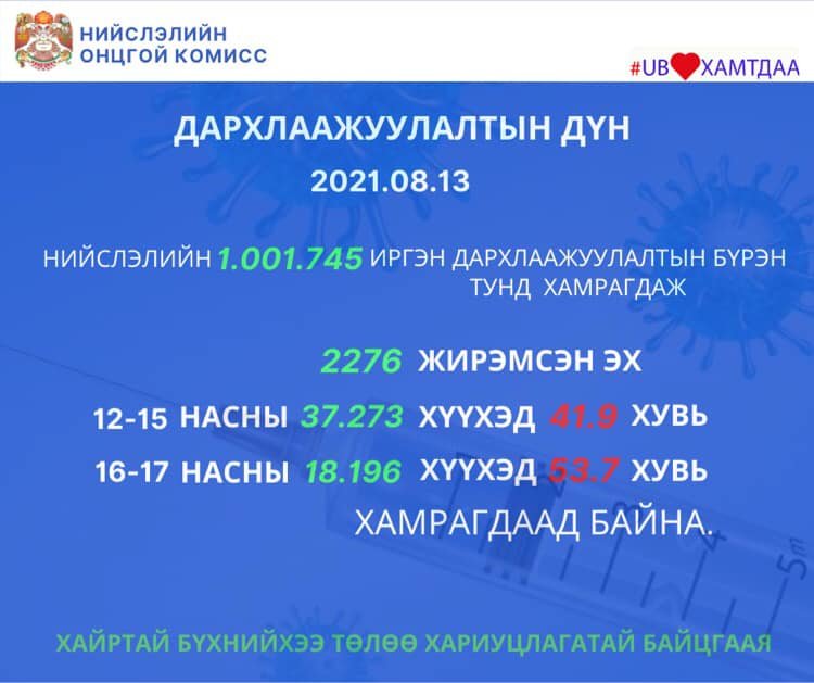 Өчигдөр буюу наймдугаар сарын 13-нд нийслэлийн хэмжээнд I тунд 1005, II тунд 2528, нийт 3533 иргэнийг дархлаажуулжээ. Вакцинжуулалт эхэлснээс хойш нийслэлийн 18-аас дээш насны 1.098.765 иргэн I тунд, 1.001.745 иргэн II тунд хамрагдаад байна. Мөн нийт 2276 жирэмсэн эх, 12-15 насны 37.273 /41.9%/, 16-17 насны 18.196 /53.7%/ хүүхэд тус тус II тунд хамрагдлаа.