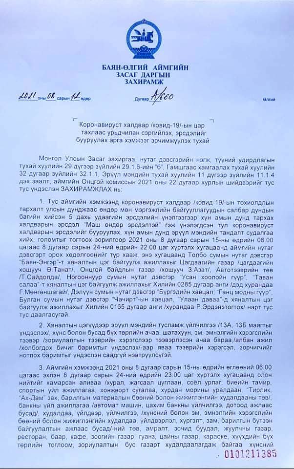 10 хоногийн хатуу хөл хорионы хугацаанд аймгийн Засаг даргын захирамжаар олон нийтийг хамарсан аливаа /хурал, жагсаал цуглаан, соёл урлаг, биеийн тамир, спортын үйл ажиллагаа, хонжворт сугалаа, хурдан морины уралдаан, “Тирлик, “Ах-Дам” зах, барилгын материалын бөөний болон жижиглэнгийн худалдааны төв/, банкны үйл ажиллагаа /автомат машин, цахим банкны үйлчилгээ, дотоод ажлаас бусад/, худалдаа, үйлдвэр, үйлчилгээ, /хүнсний болон эм, эмнэлгийн хэрэгслийн бөөний болон жижиглэнгийн худалдаа, үйлдвэрлэл, хүргэлт, зам, барилгын бүтээн байгуулалтын ажлаас бусад/-ний төв, амралт, зочид буудал, жуулчны газар, ресторан, баар, кафе, зоогийн газар, гуанз, цайны газар, караоке, хүүхдийн бүх төрлийн тоглоом, зориулалтын бус газарт худалдаалагдаж байгаа хүнсний худалдааны үйл ажиллагааг түр зогсоож, энэ хугацаанд архи согтууруулах ундаа худалдах, түүгээр үйлчлэхийг мөн гэрийн нөхцөлд хурим, найр /худ ургийн цай, бэр гуйх, хүлээн авалт зэрэг/ бусад төрлийн цайллага хийхийг тус тус хориглосон байна.