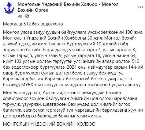 Өнөөдөр буюу наймдугаар сарын 16-нд 512 бөх зодоглоно. Тодруулбал, Монгол улсад залуучуудын байгууллага үүсэж хөгжсөний 100 жил, Монголын Үндэсний Бөхийн Холбооны 30 жил, Монгол бөхийг дэлхийн дээд амжилт Гиннест бүртгүүлсний 10 жилийн ойд зориулсан бөхийн барилдаан өнөөдөр болон маргааш болно. Уг барилдаанд улсын аварга 4, улсын арслан 3, улсын гарьд 5, улсын заан 9, улсын харцага 18, улсын начин 64, нийт 103 улсын цолтон тэргүүтэй улс, аймгийн алдар цолтой 512 бөх зодоглохоор бүртгүүлжээ. 2021 оны наймдугаар сарын 14-ний өдөр бүртгүүлсэн сумын цолтон болон залуу бөхчүүд тус барилдаанд багтаж барилдах боломжгүй болжээ. Тиймээс эдгээр бөхчүүд МҮБХ-ны санхүүгээс мандатын төлбөрөө буцаан авна уу.