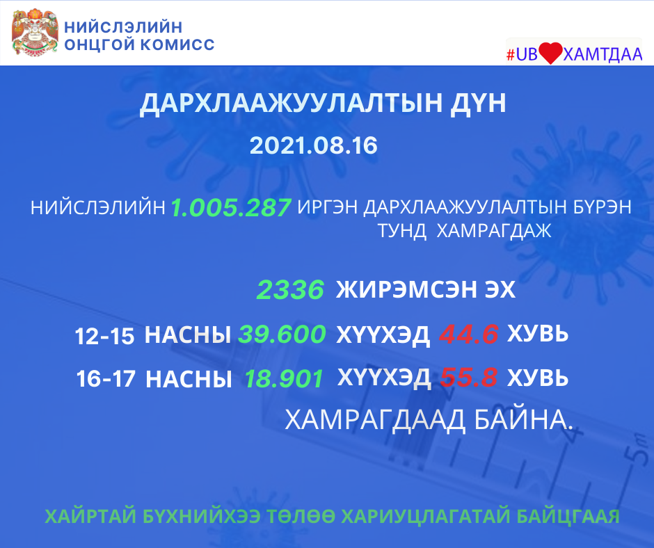 Өчигдөр буюу наймдугаар сарын 16-нд нийслэлийн хэмжээнд I тунд 693, II тунд 2022, нийт 2715 иргэнийг дархлаажуулжээ. Вакцинжуулалт эхэлснээс хойш нийслэлийн 18-аас дээш насны 1.100.140 иргэн I тунд, 1.005.287 иргэн II тунд хамрагдаад байна. Мөн нийт 2336 жирэмсэн эх, 12-15 насны 39.600 /44.6%/, 16-17 насны 18.901 /55.8%/ хүүхэд тус тус II тунд хамрагджээ.