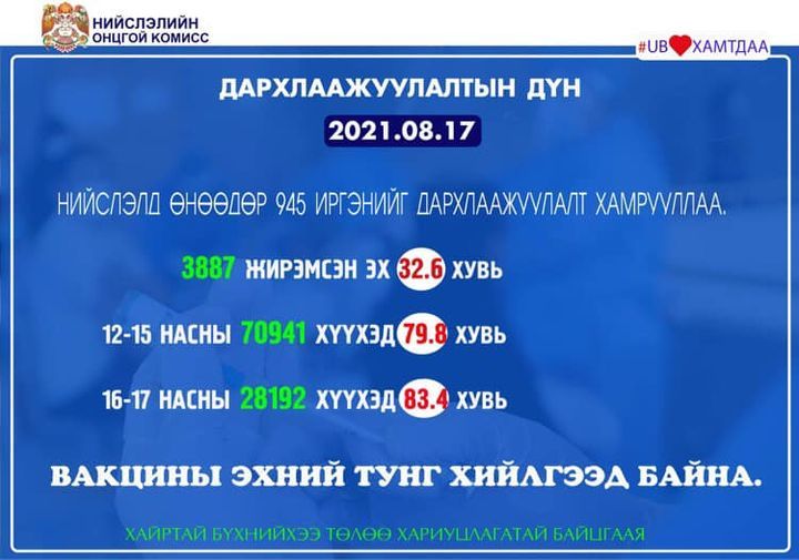 2021.08.17-нд нийслэлийн хэмжээнд I тунд 163, II тунд 633, III тунд 149 (зорилтот бүлгийн), нийт 945 иргэнийг дархлаажуулалтад хамрууллаа.