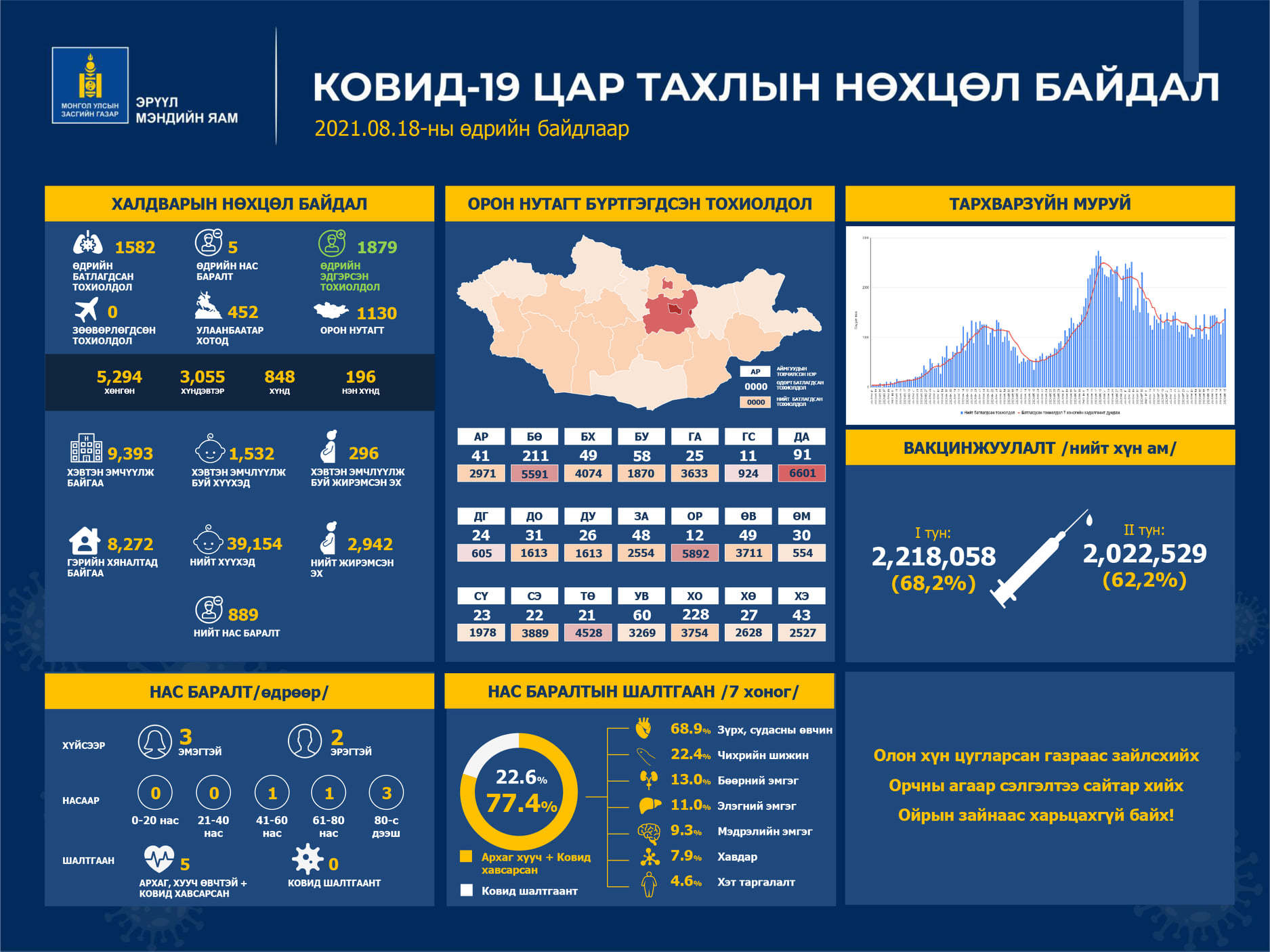 Өнөөдрийн байдлаар 9 393 хүн эмчилгээнд байгаа. Биеийн байдлыг үнэлбэл, 5 294 хүн хөнгөн, 3 055 хүндэвтэр, хүнд 848, маш хүнд 196 хүн байна.